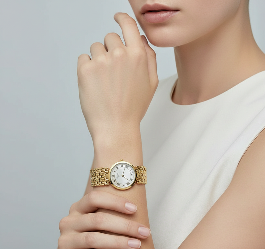 This exquisite Christian Dior gold-plated watch with a Mother of Pearl dial is a timeless blend of elegance and sophistication. The lustrous gold-plated case exudes luxury, while the iridescent Mother of Pearl dial adds a refined touch, capturing the light with every movement. The watch features delicate markers and hands, offering a clear, precise timekeeping experience. Perfect for both formal and casual occasions, this piece combines classic style with modern flair, making it a must-have accessory for those who appreciate fine craftsmanship and understated beauty. Ideal for anyone seeking a versatile, high-end timepiece that exudes grace and refinement.