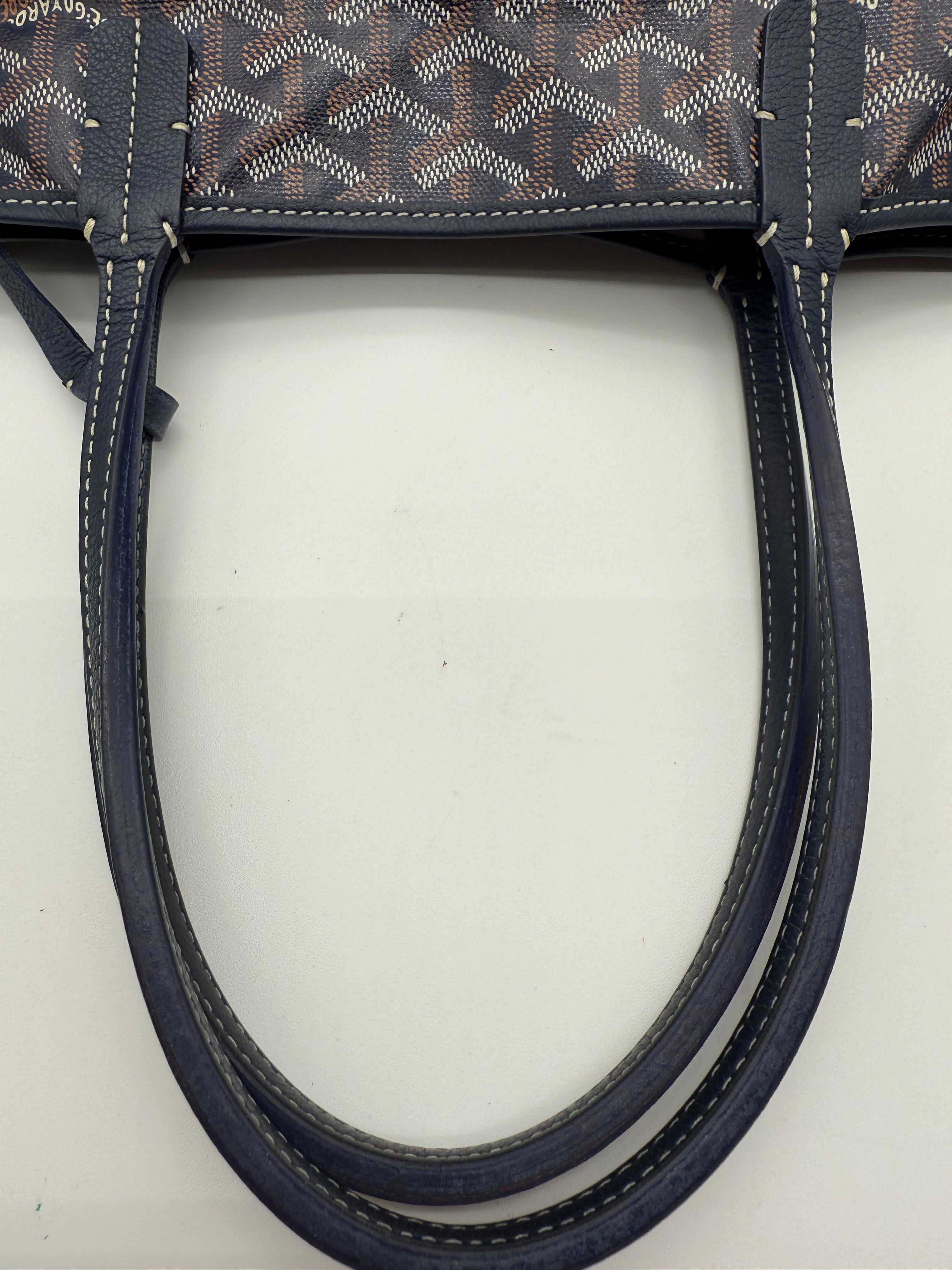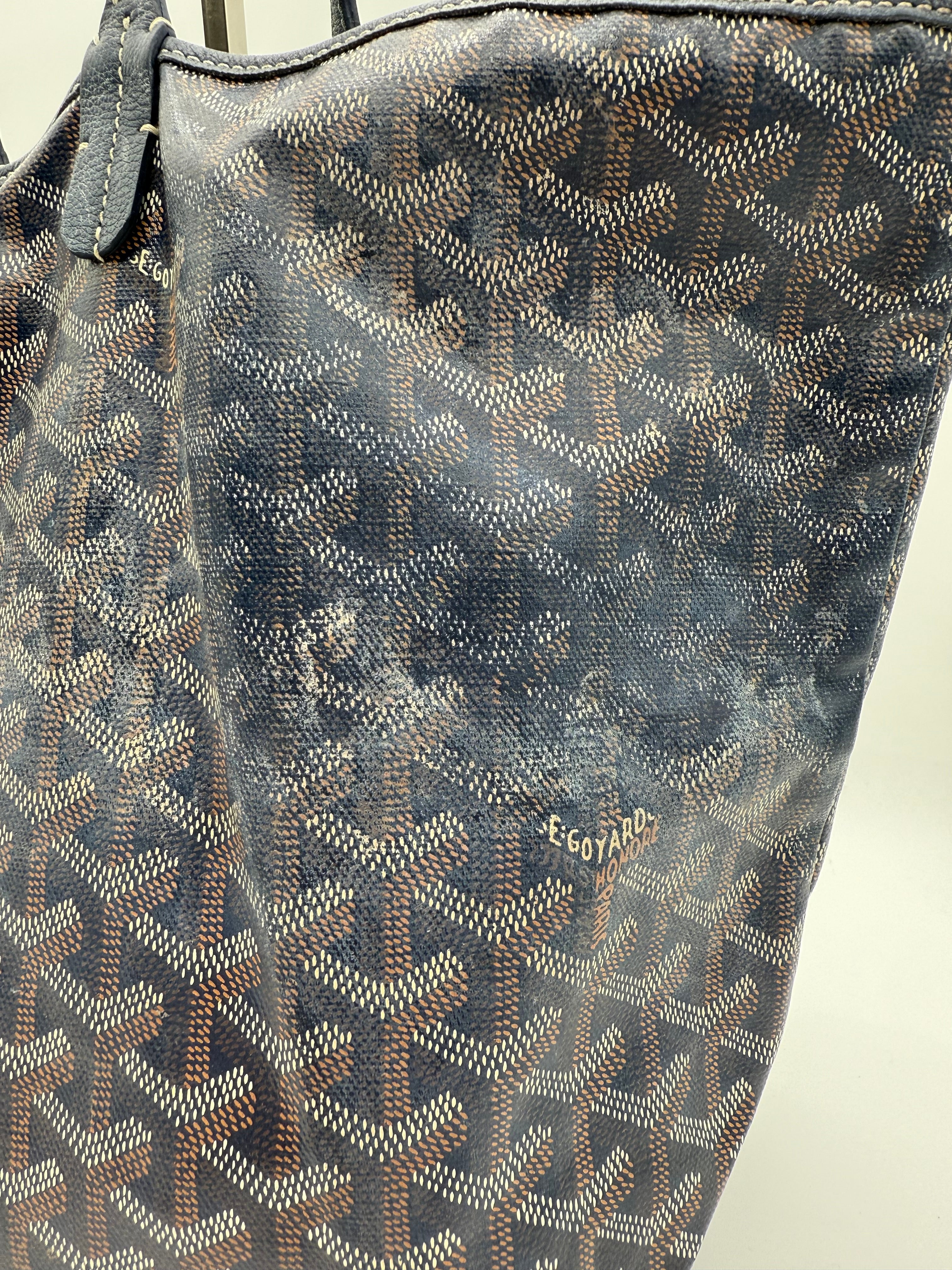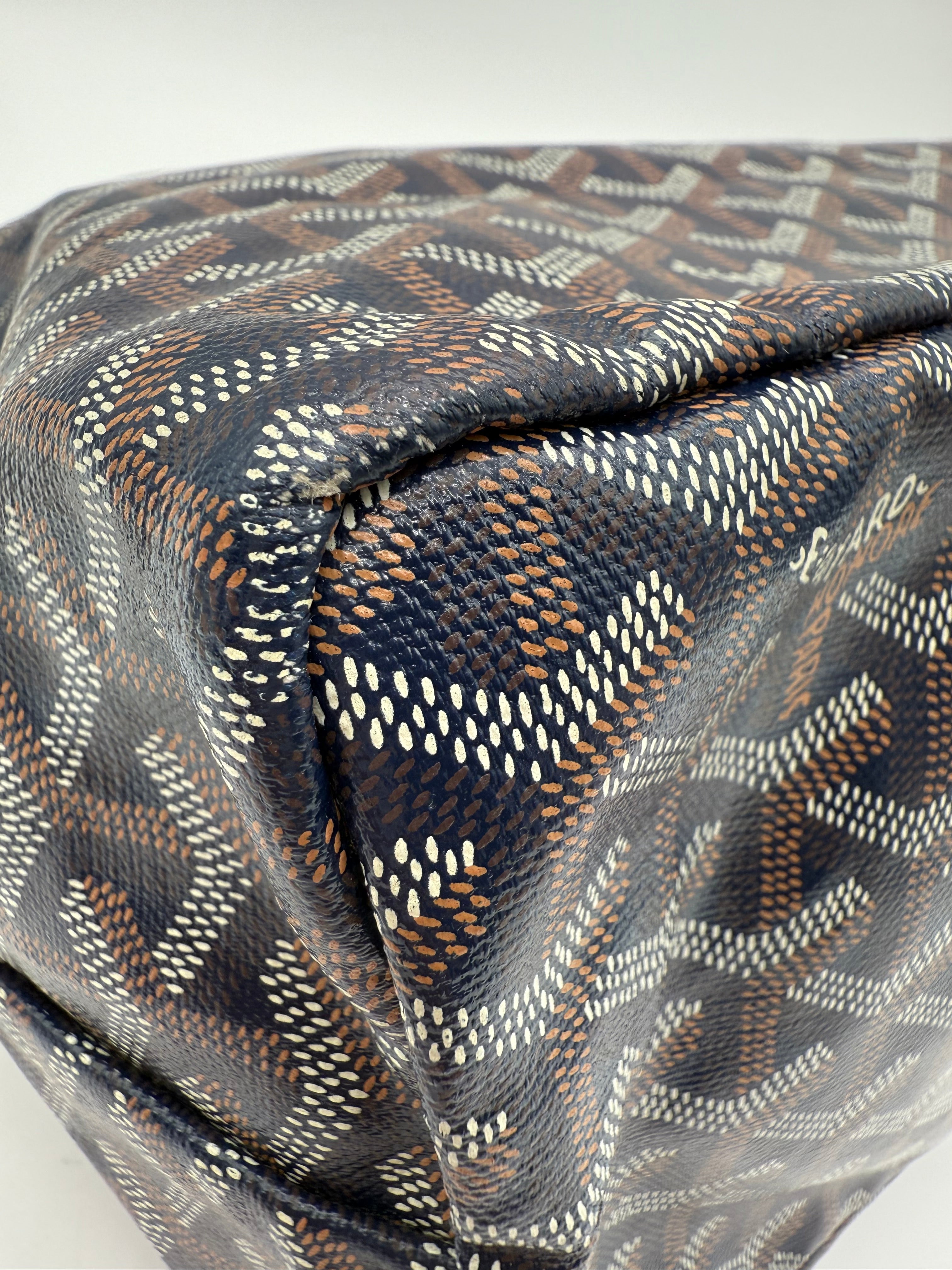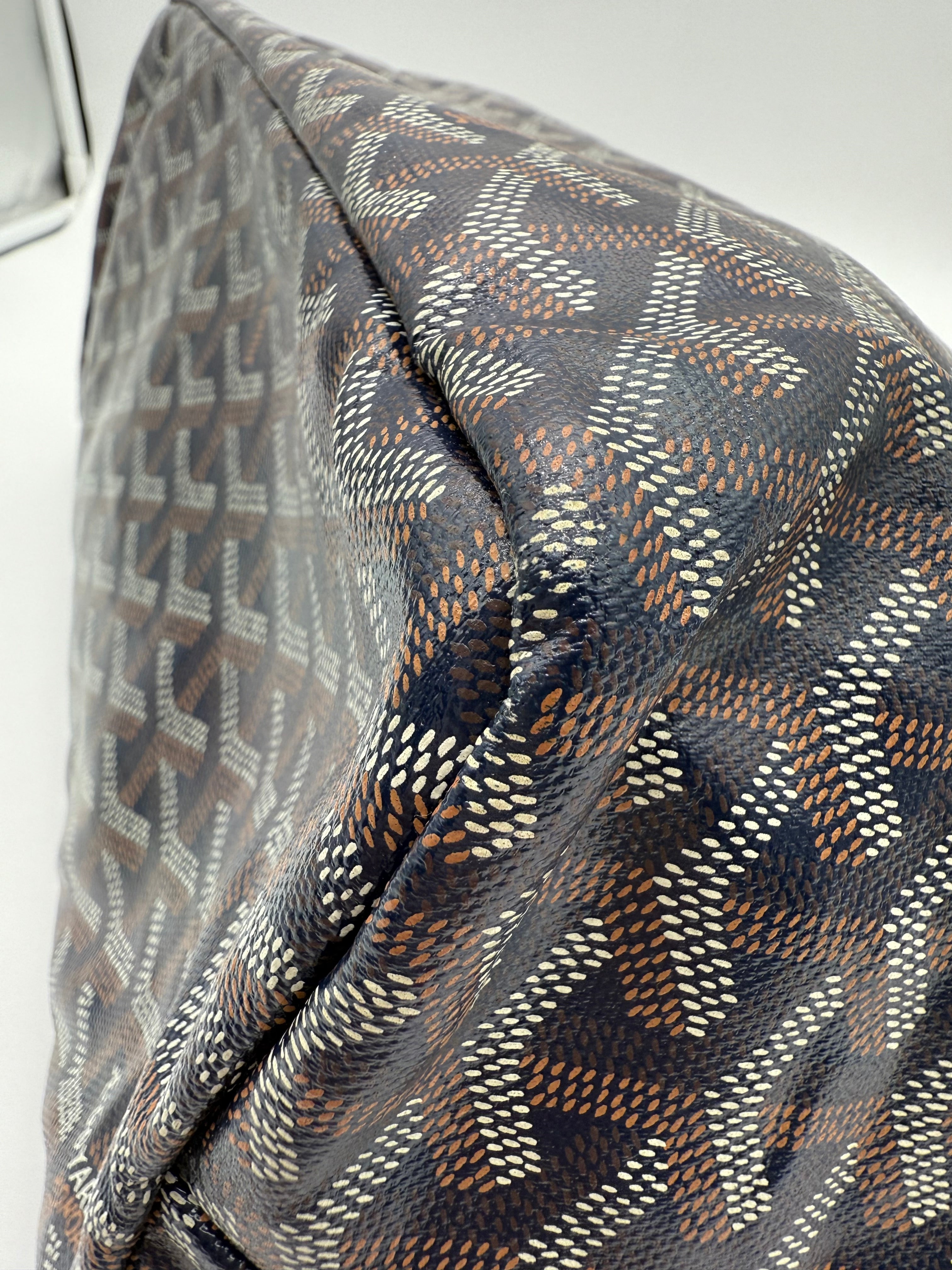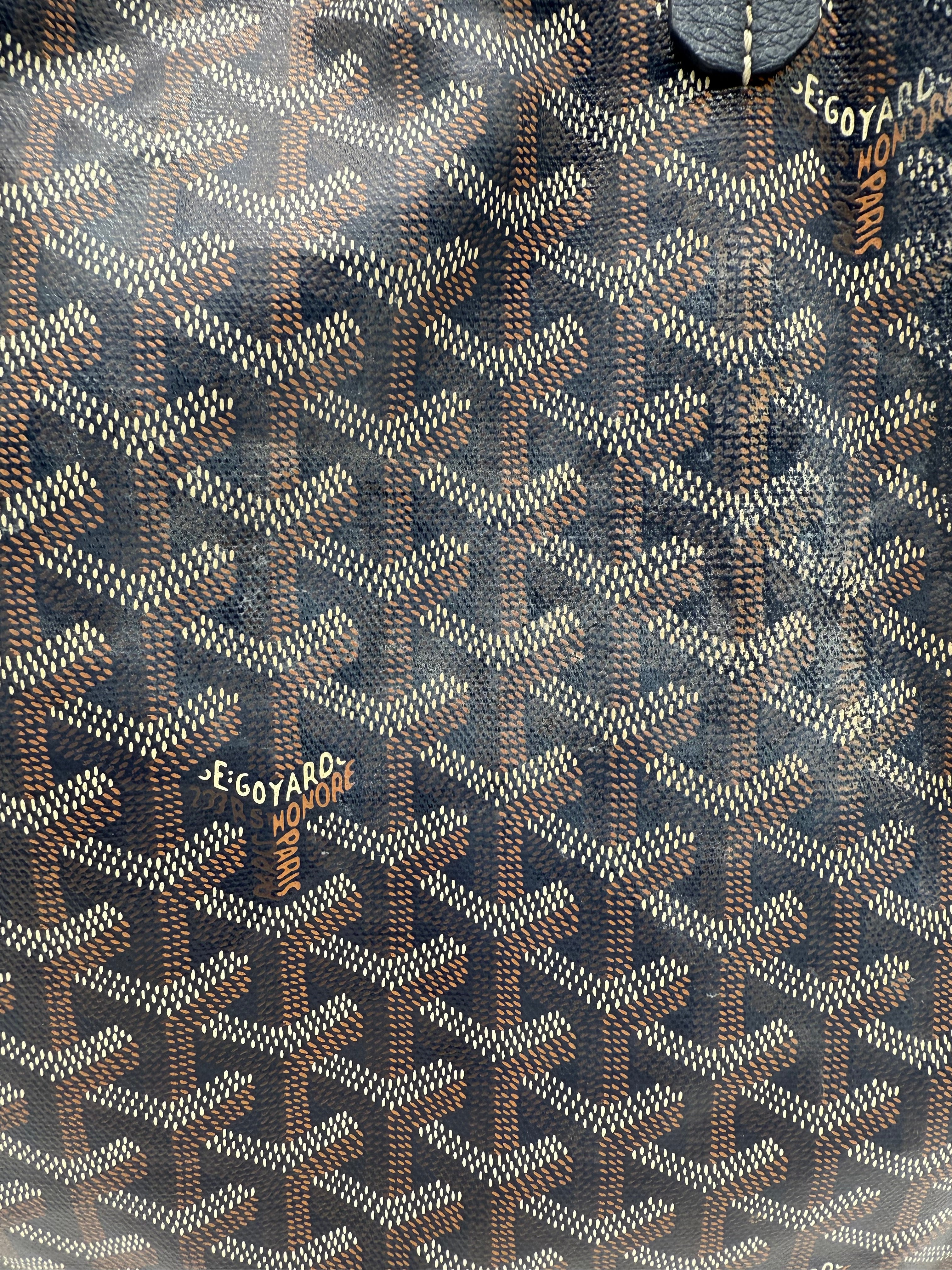 This pre-owned bag shows signs of gentle wear consistent with its age. The iconic Goyardine canvas on the exterior features some fading of the print, adding character and a unique vintage charm. There are minor corner rubs, but no holes. The bag remains structurally sound and retains its luxurious appeal.