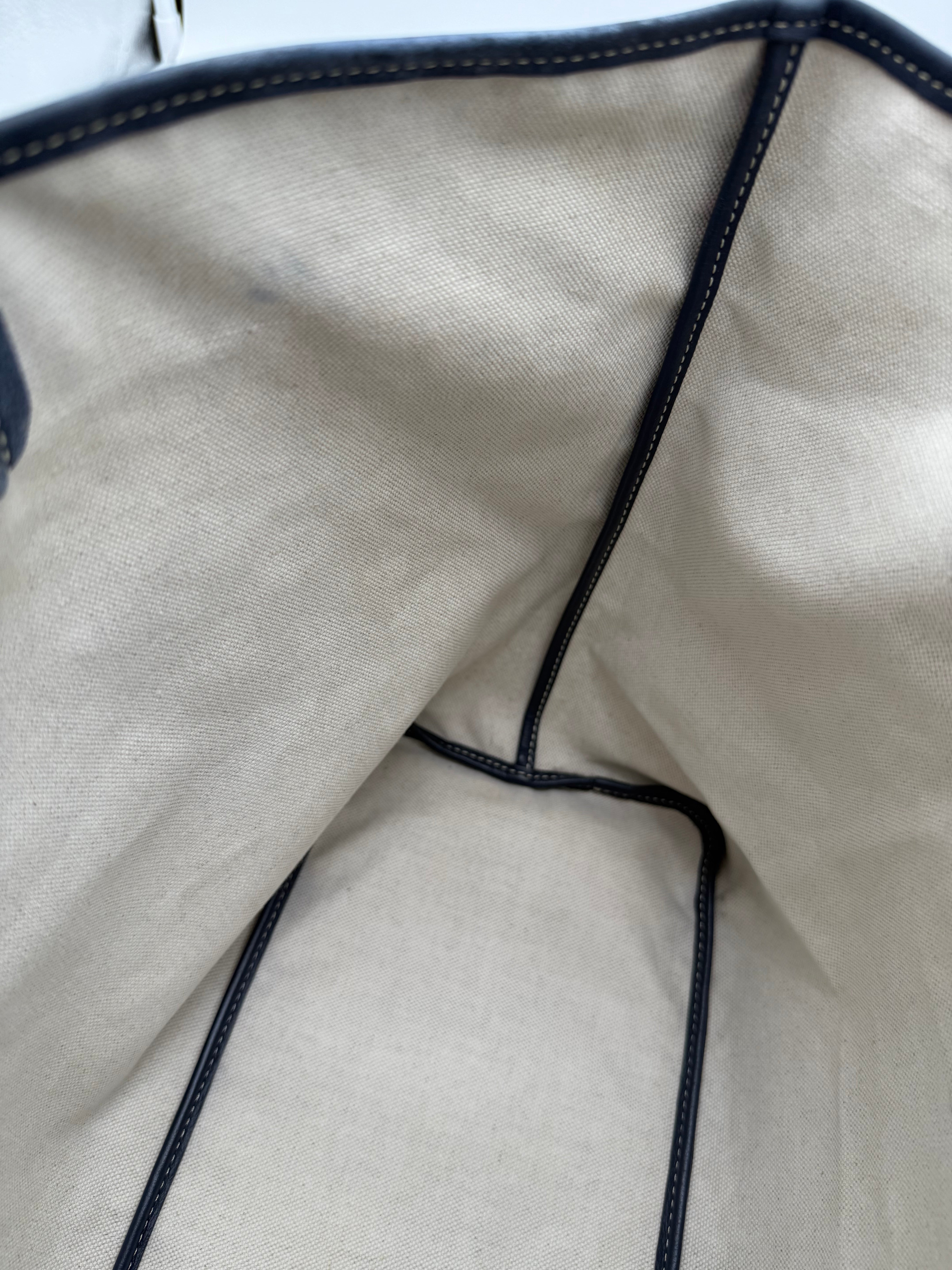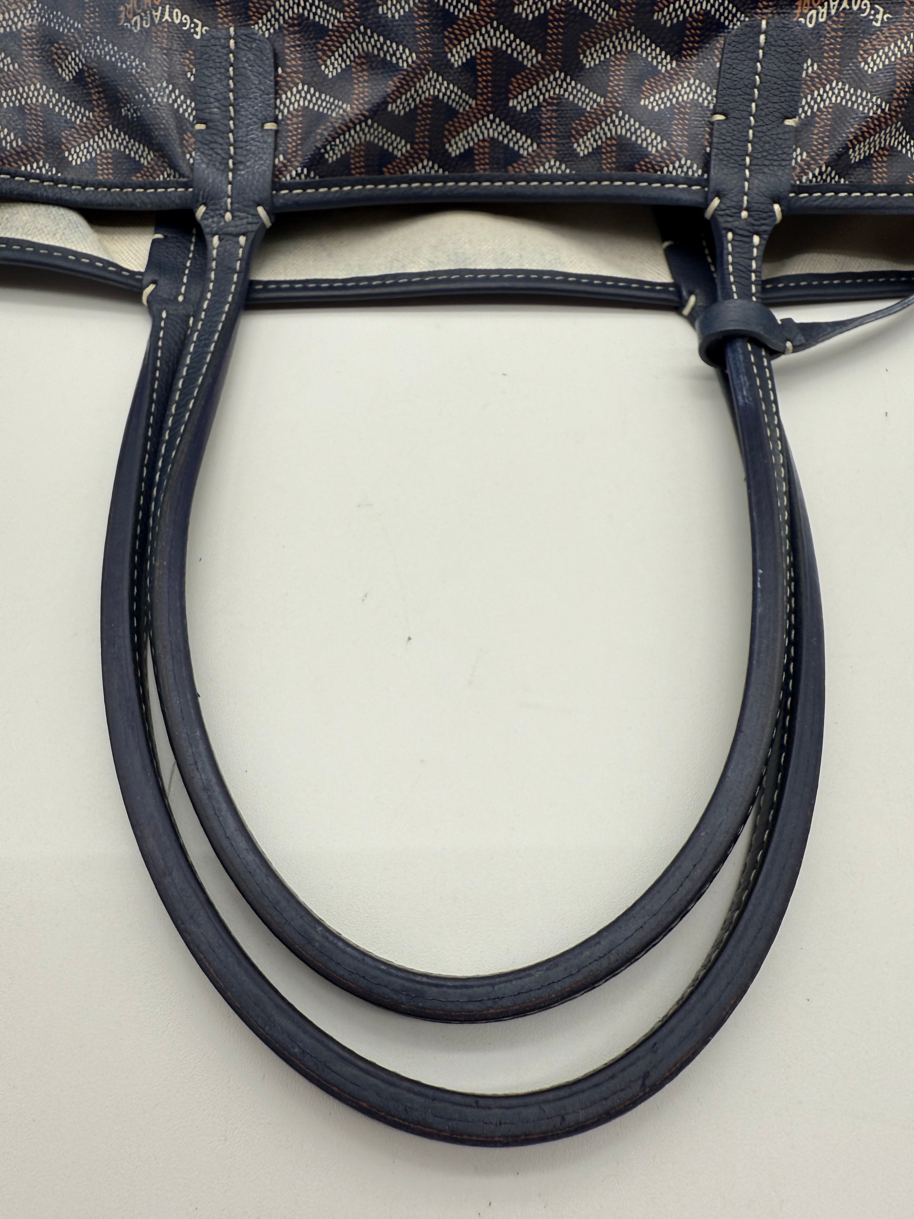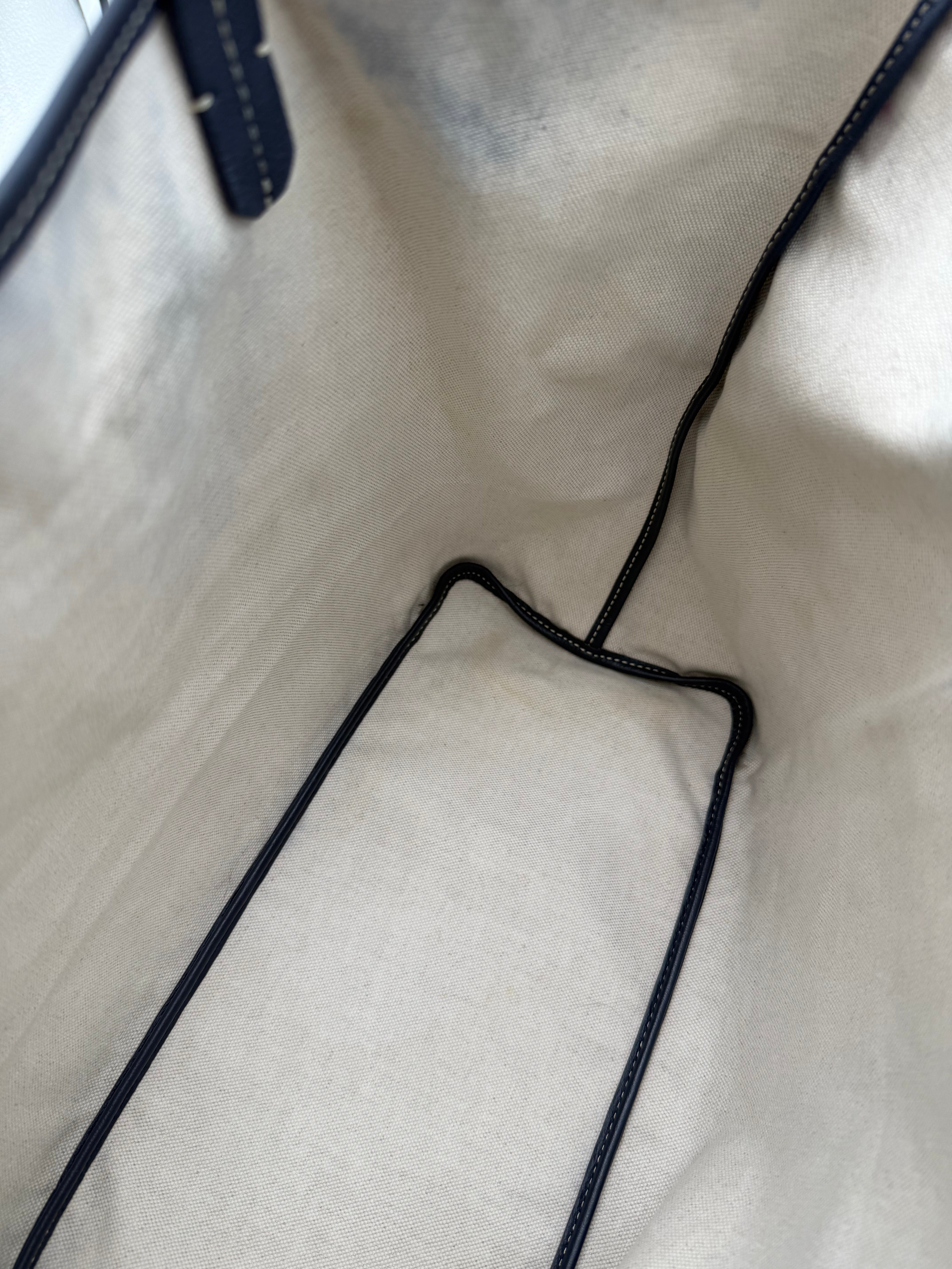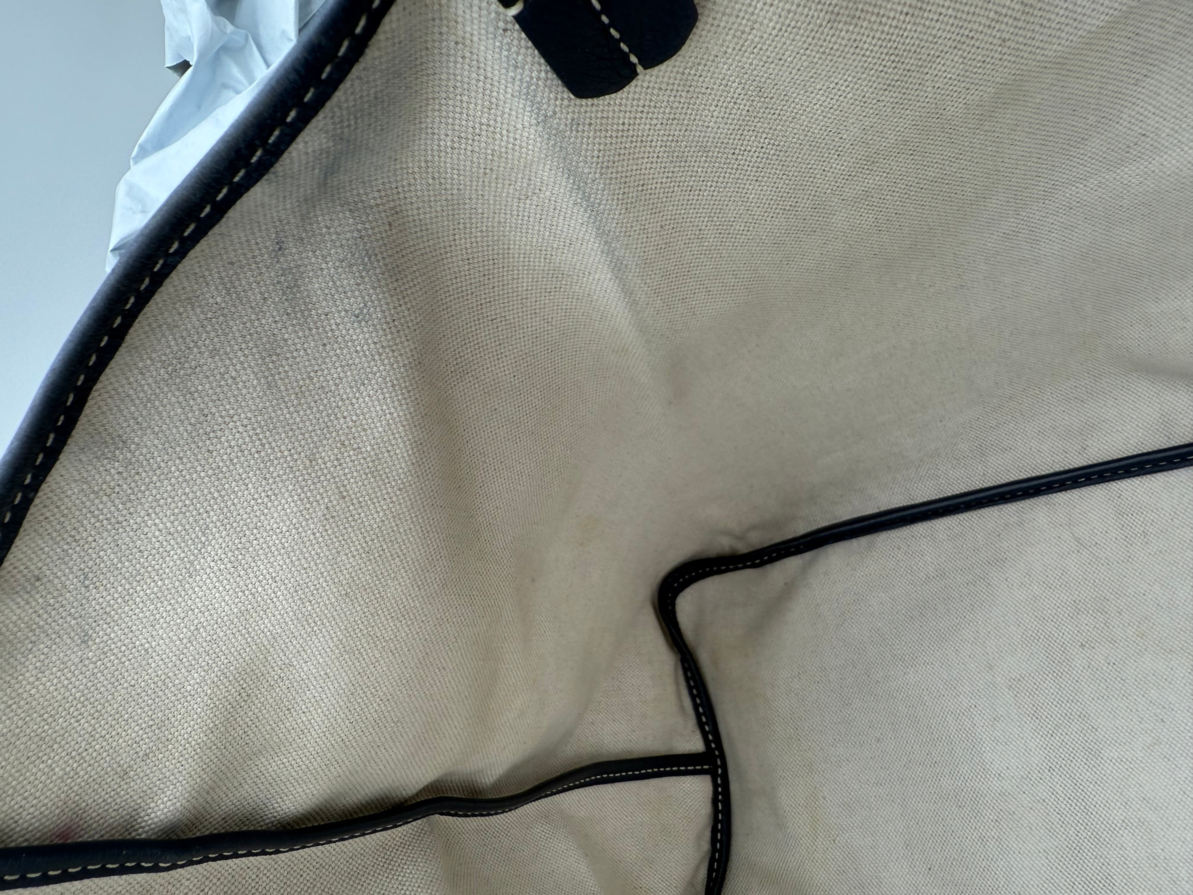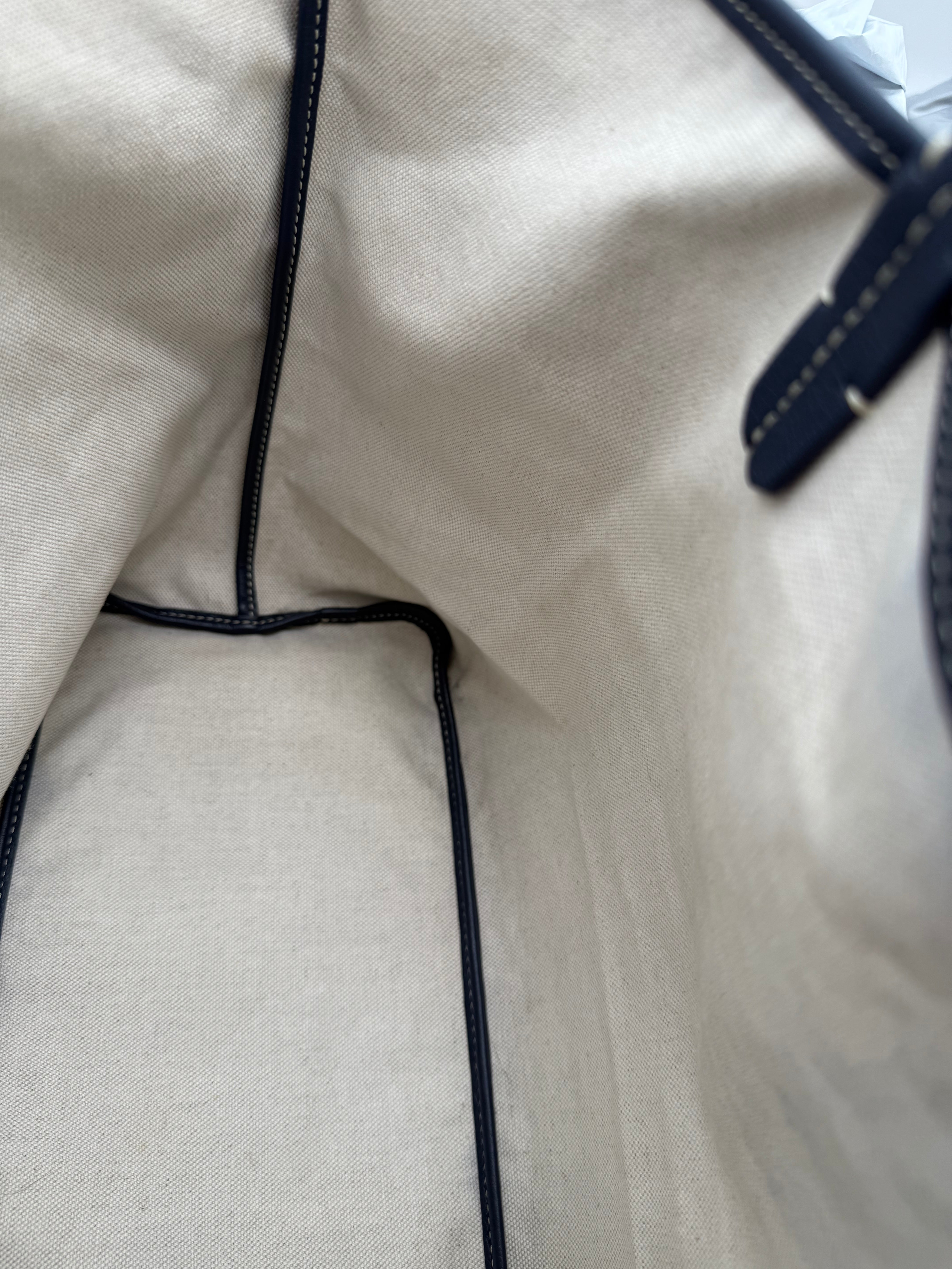 This pre-owned bag shows signs of gentle wear consistent with its age. The iconic Goyardine canvas on the exterior features some fading of the print, adding character and a unique vintage charm. There are minor corner rubs, but no holes. The bag remains structurally sound and retains its luxurious appeal.