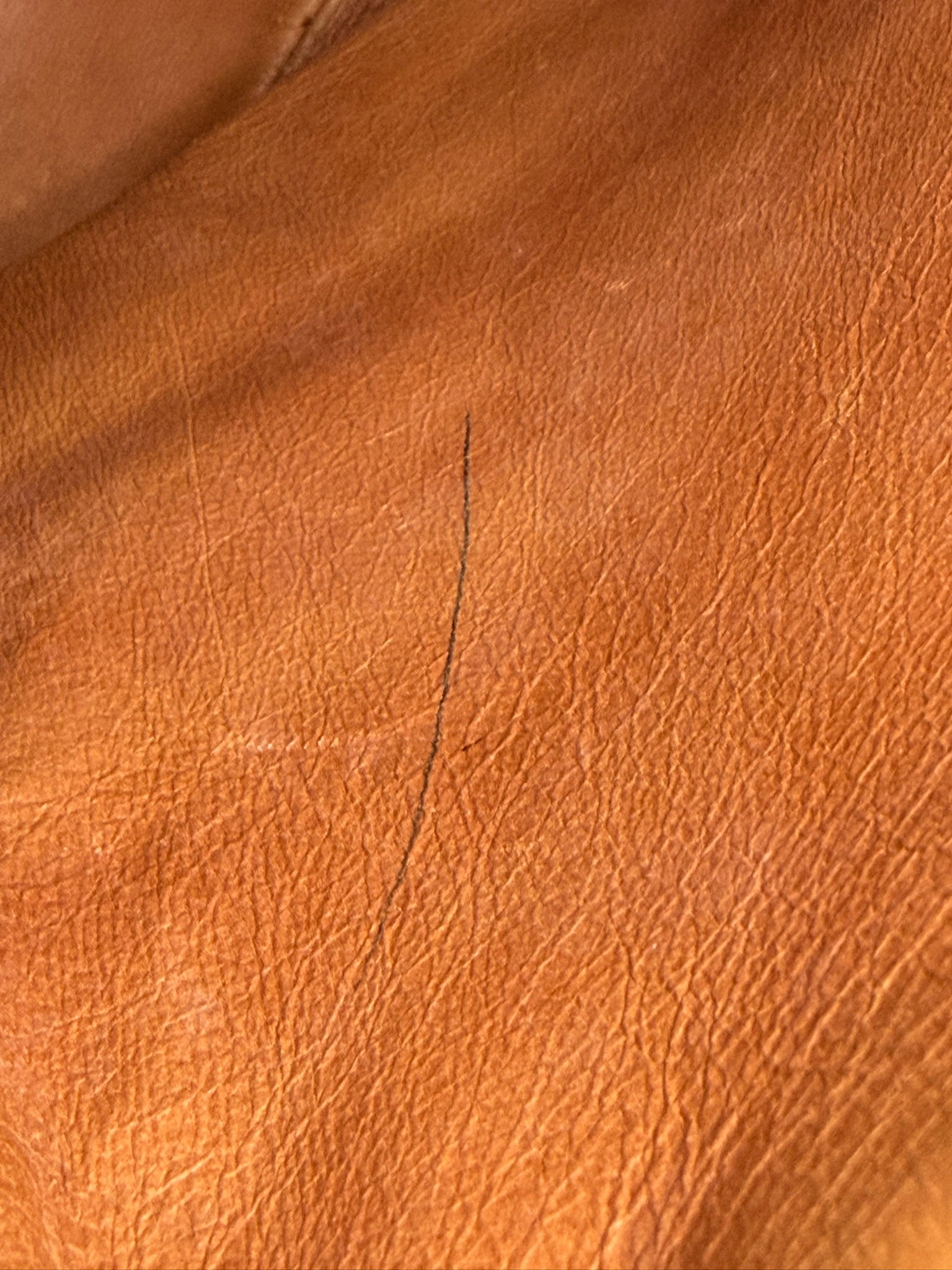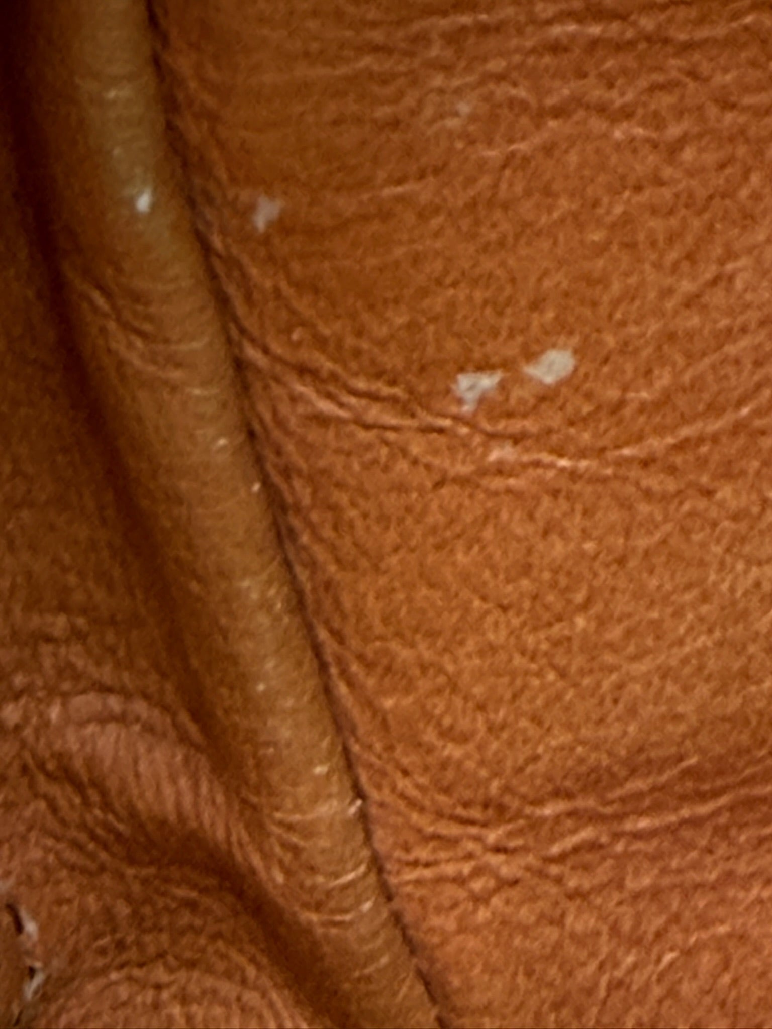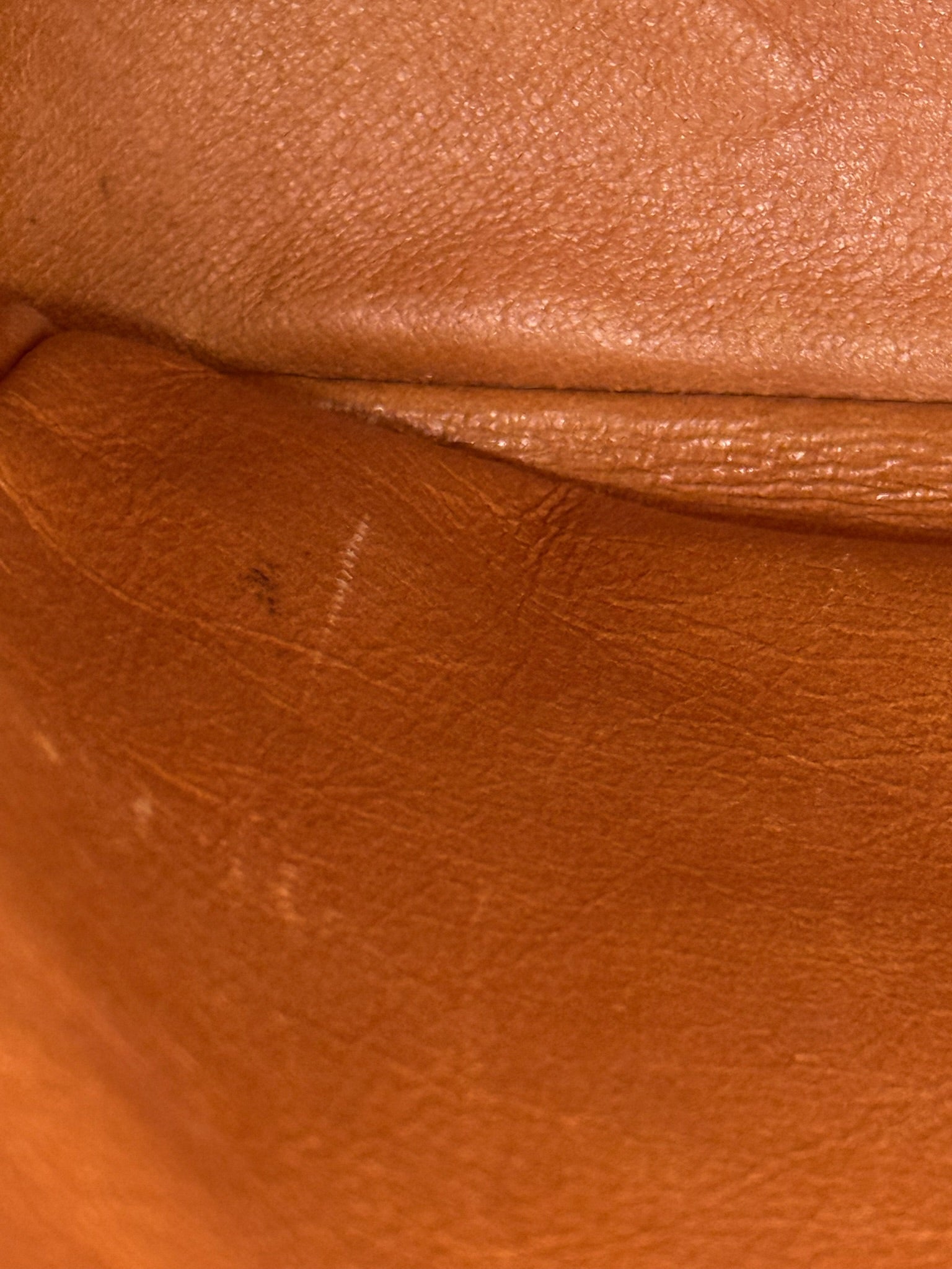 Corners show deep rubs and dryness, no exposed piping