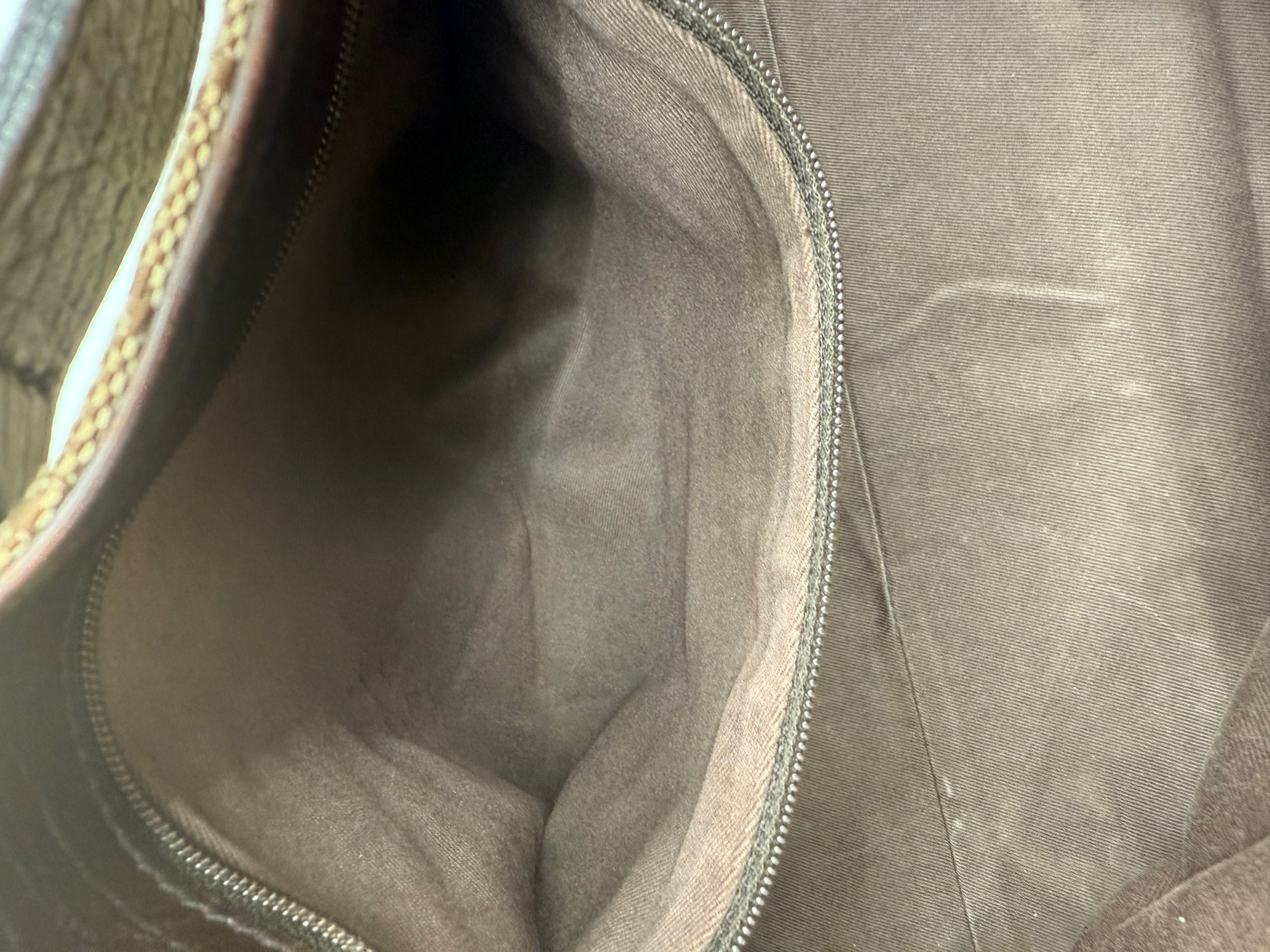 Interior: Lining is a bit faded but overall clean, with no stains; roomy interior includes a zip pocket for organization.