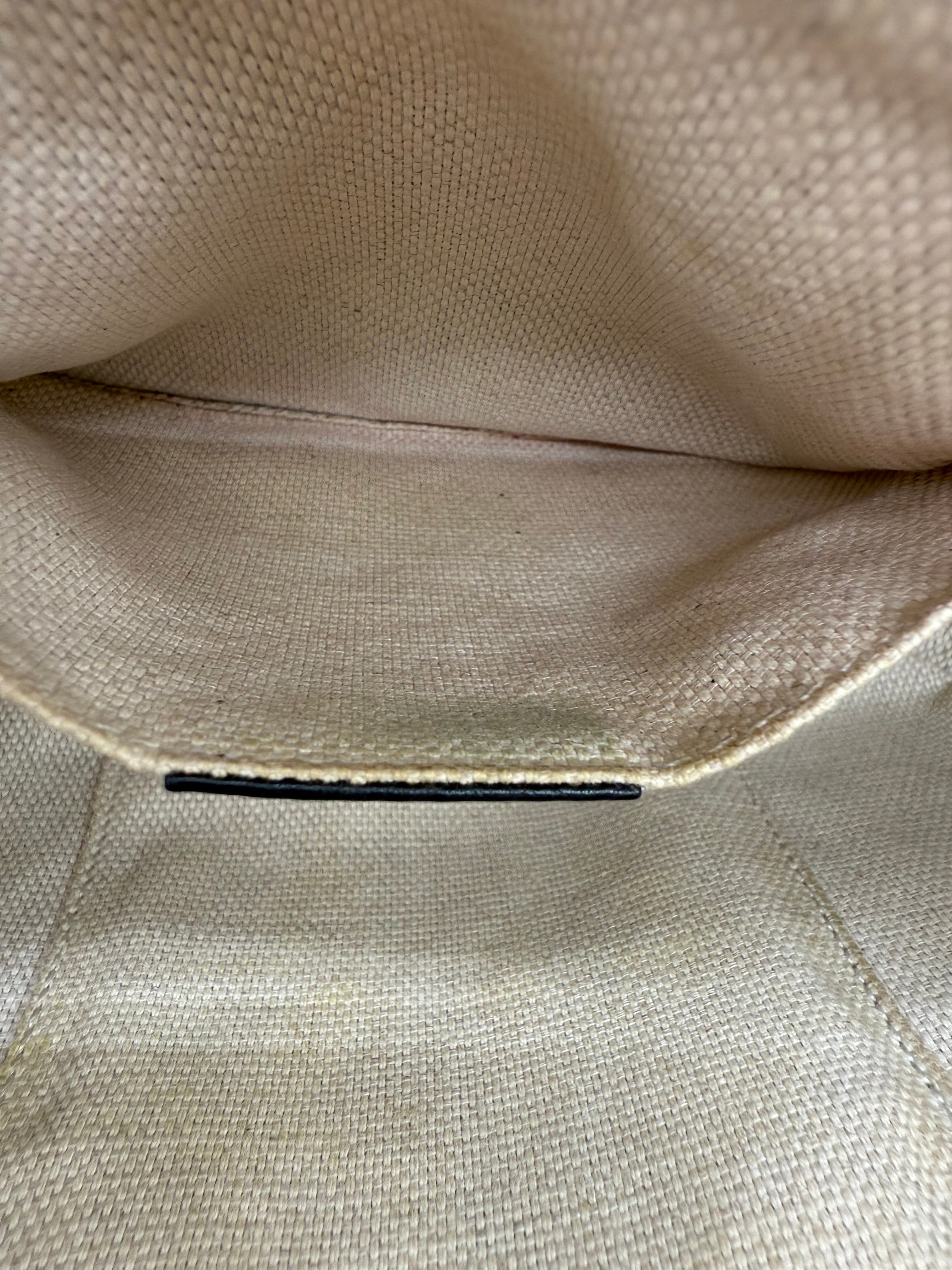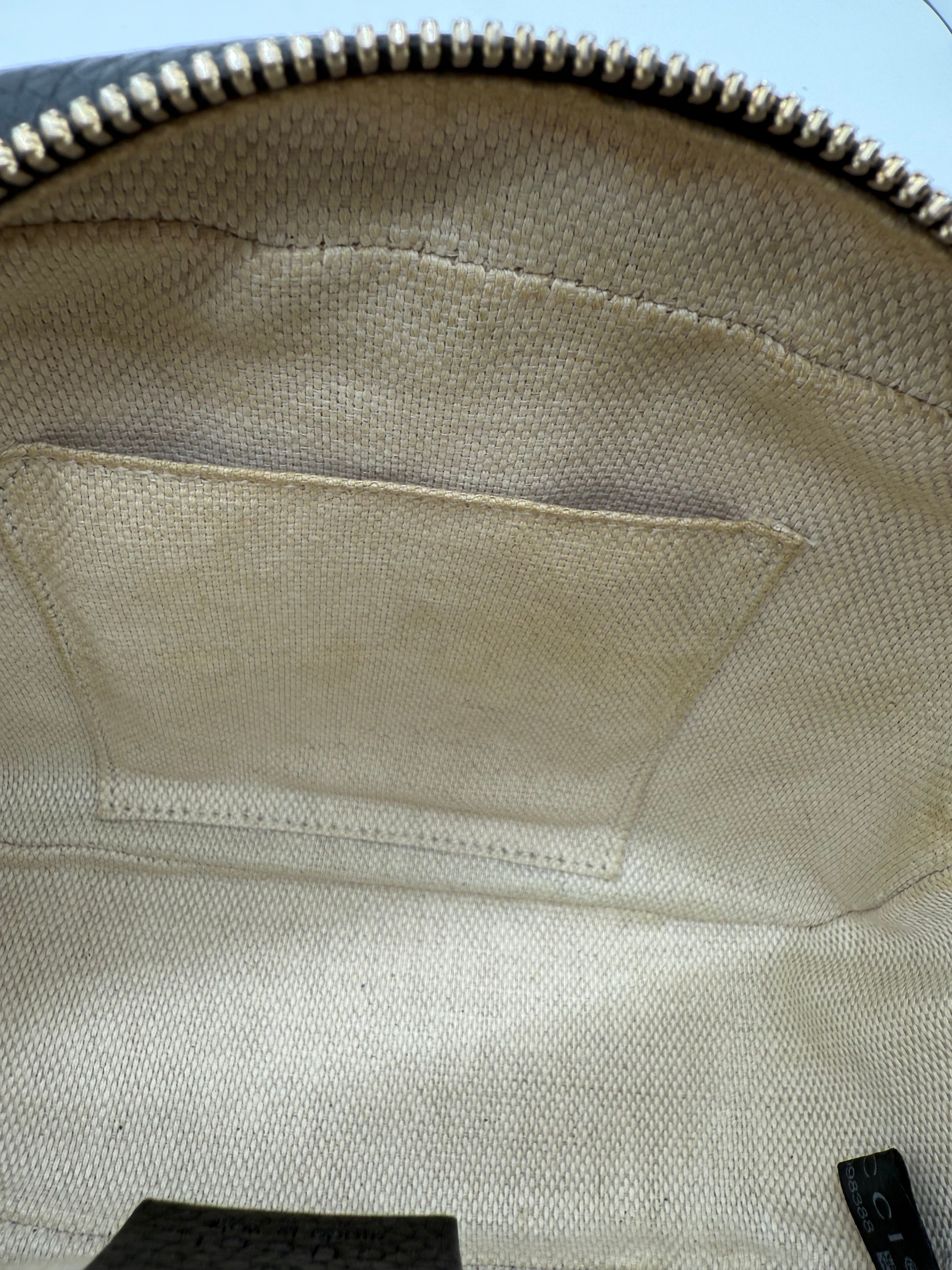 This preowned piece features a structured yet supple silhouette, a top zip closure with a playful leather tassel, and an adjustable shoulder strap for versatile wear. The spacious interior includes two smartphone pockets and a slip compartment to keep your essentials organized on the go.