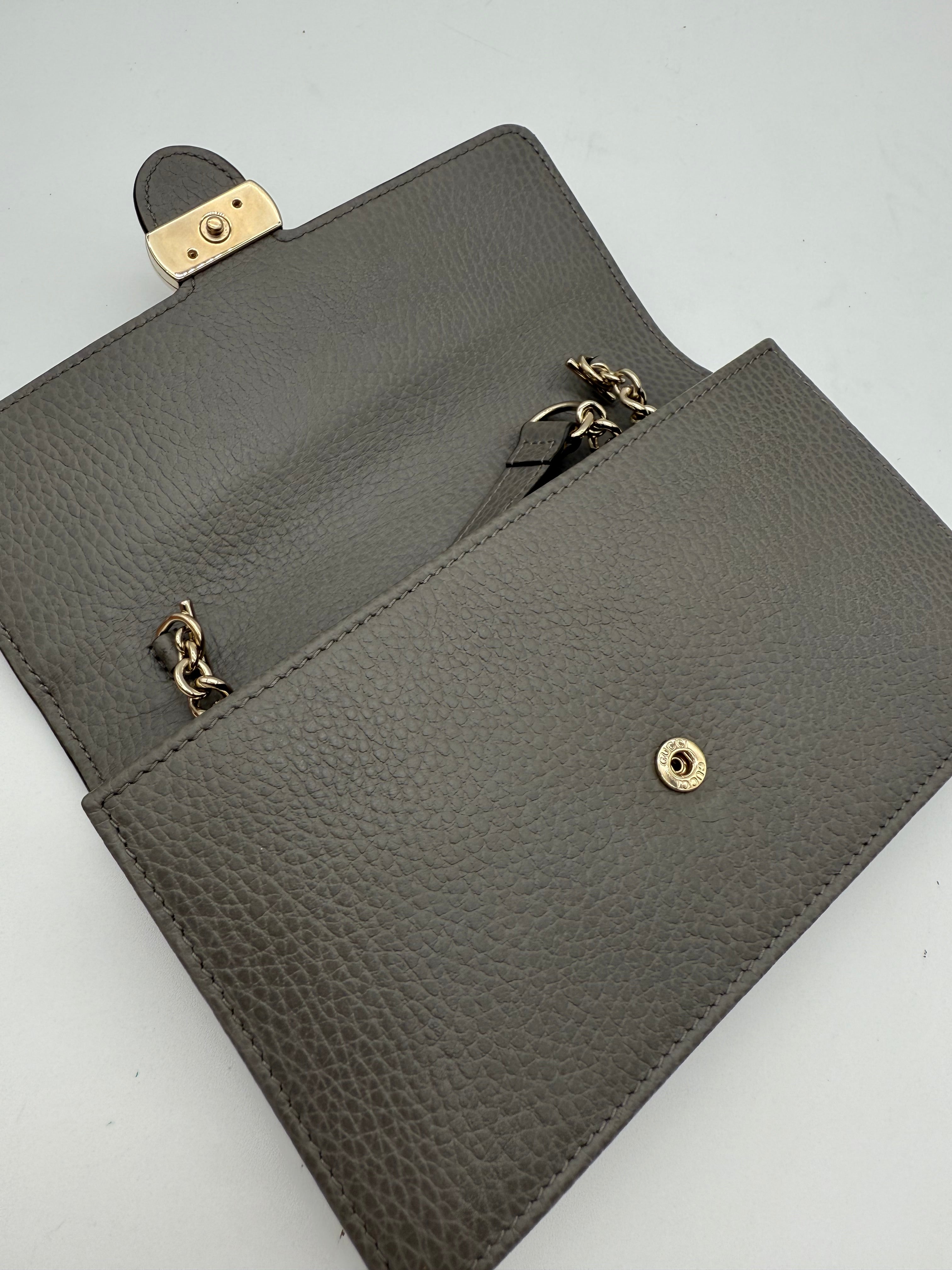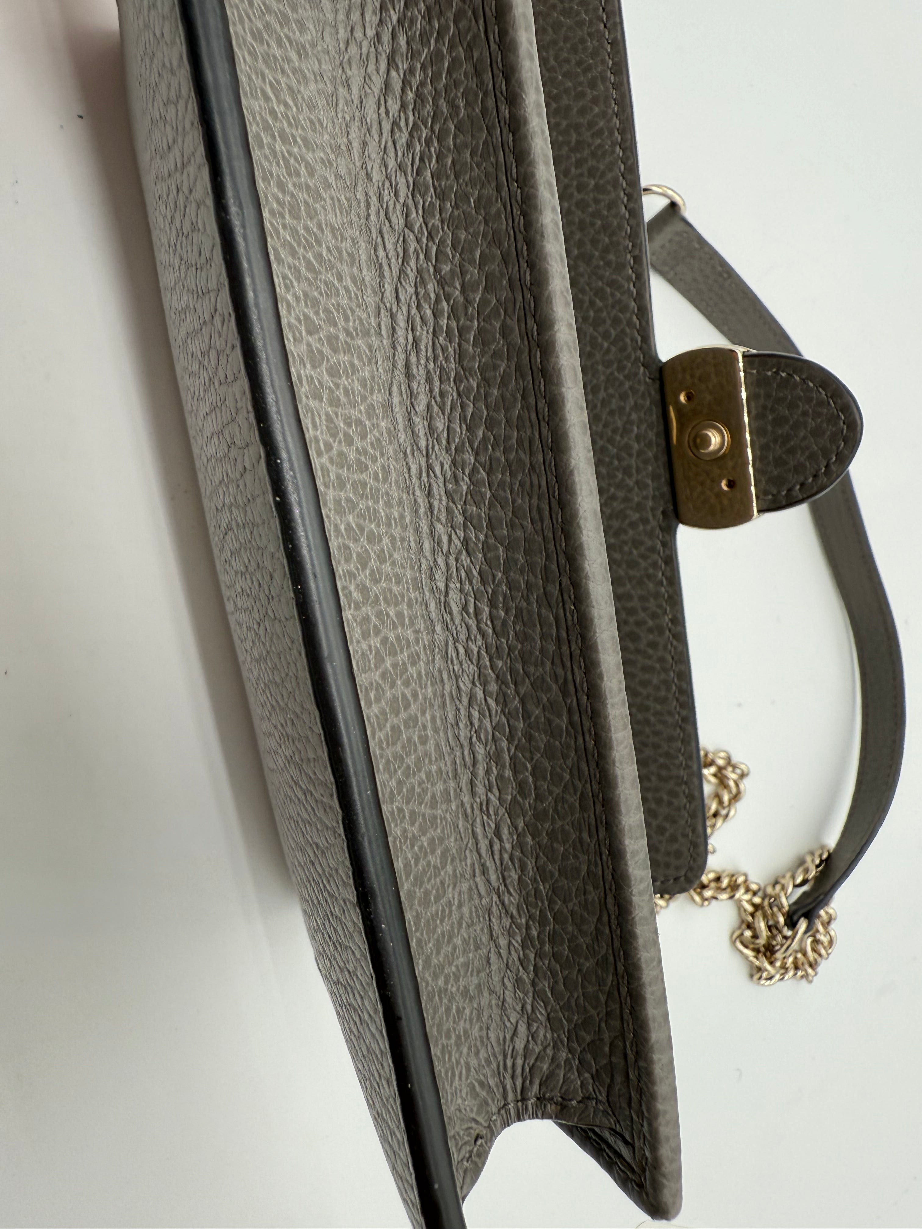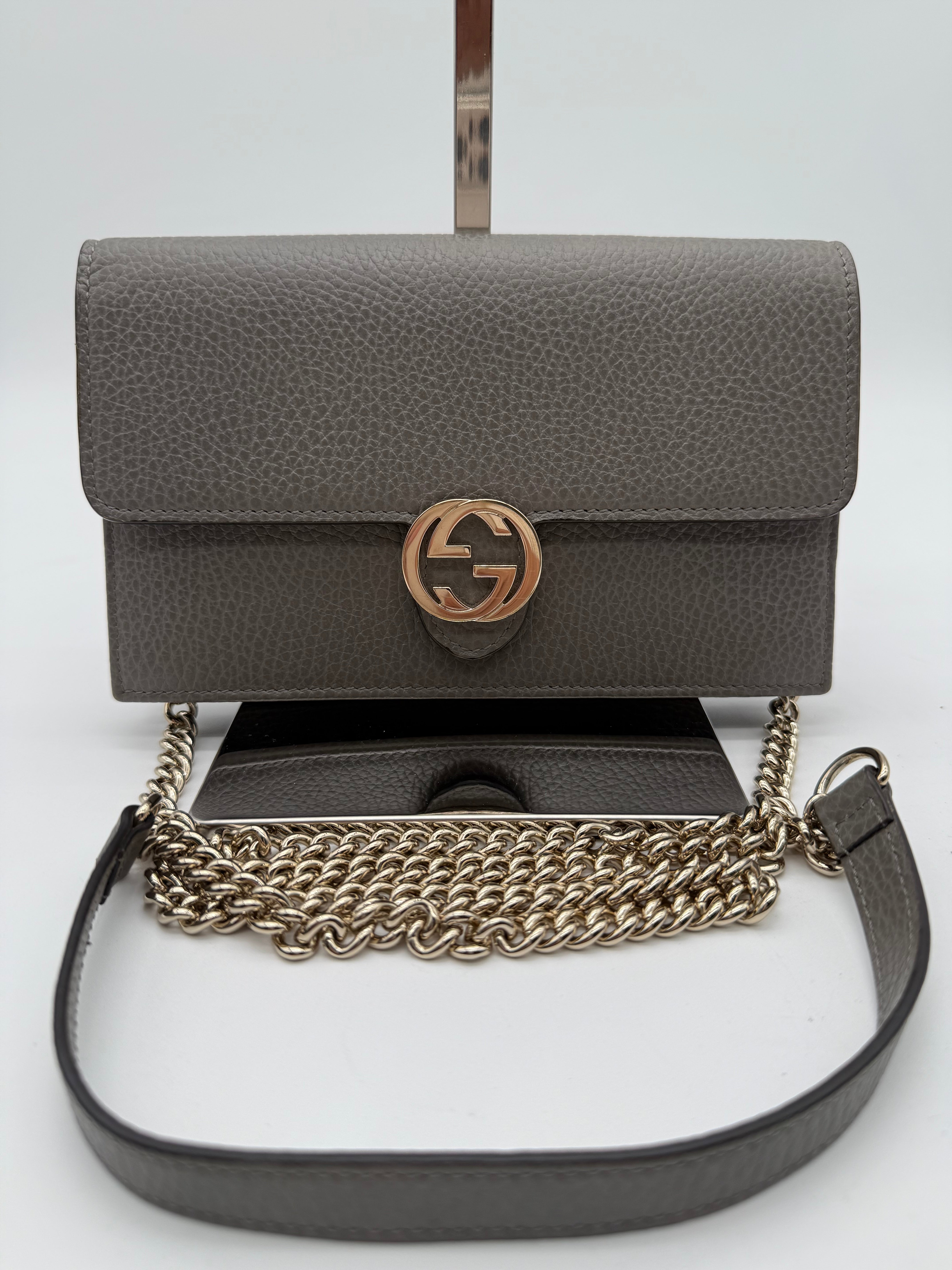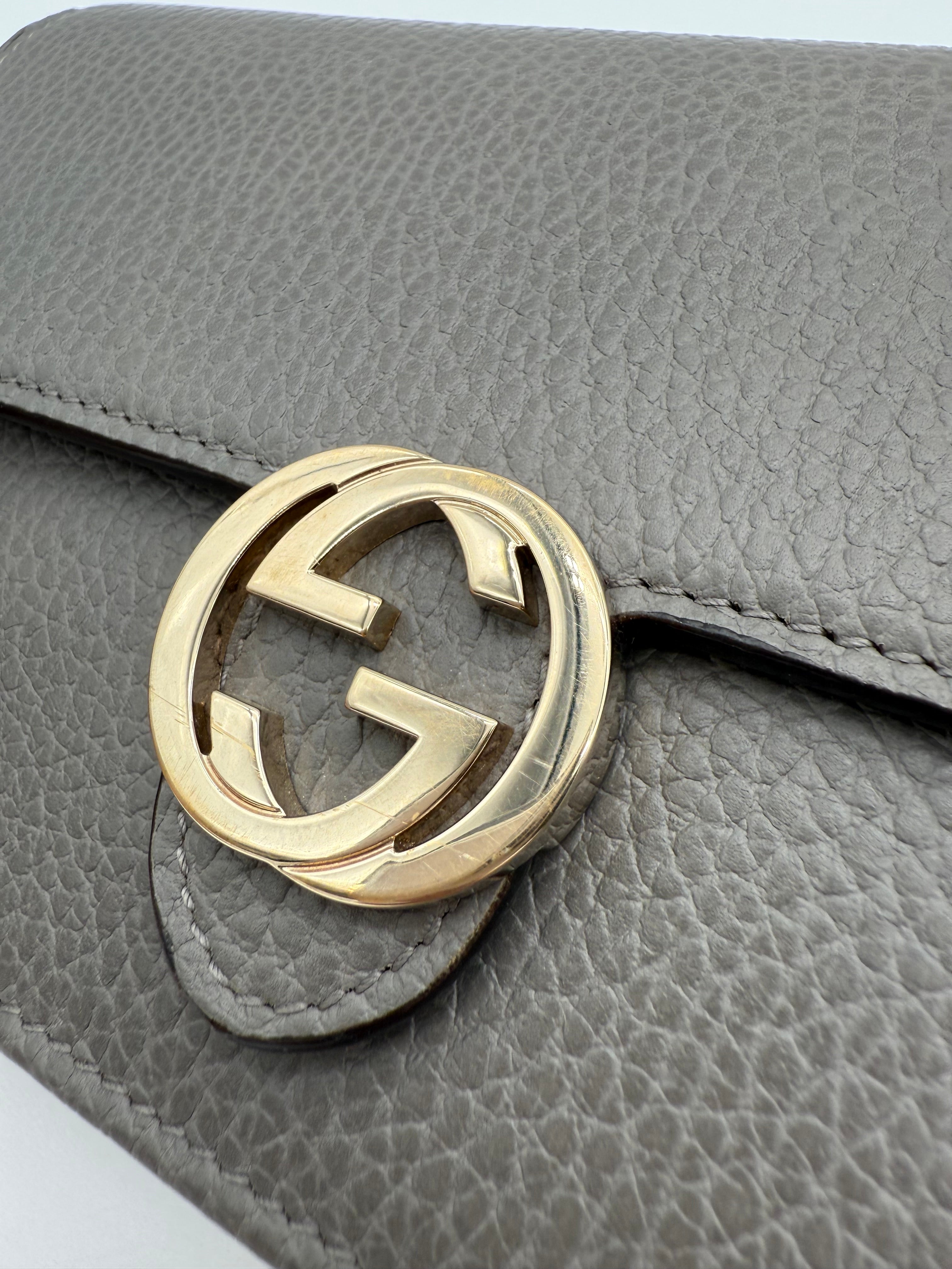 Add a touch of sophistication to your collection with this pre-owned Gucci Interlocking GG Dollar WOC (Wallet on Chain) in gray pebbled leather. Known for its sleek design and versatility, this WOC combines the best of both worlds—luxury and functionality(can even fit iPhone ProMax). Perfect for day-to-night wear, this bag is a stylish companion that easily transitions from casual to elegant looks.