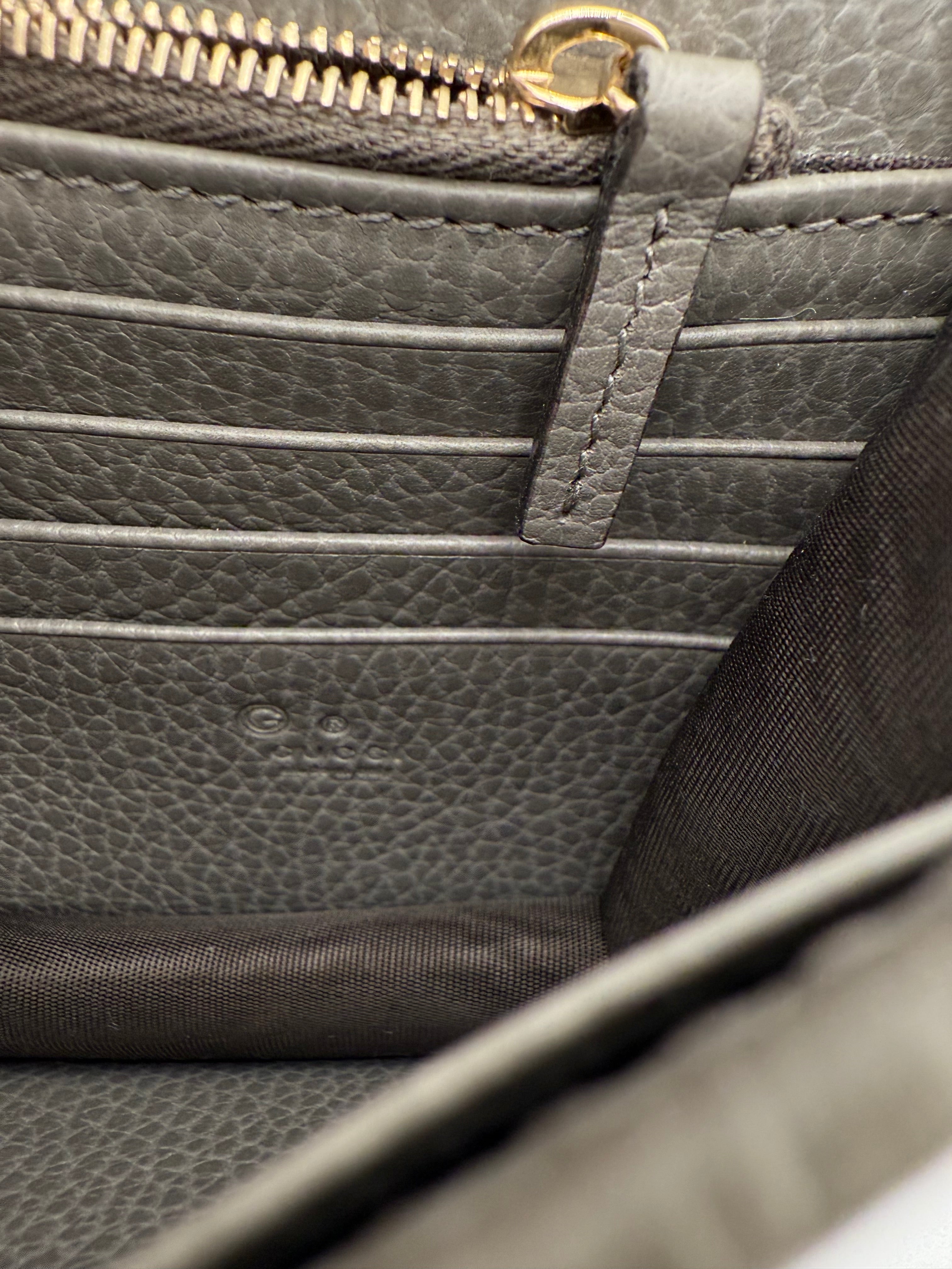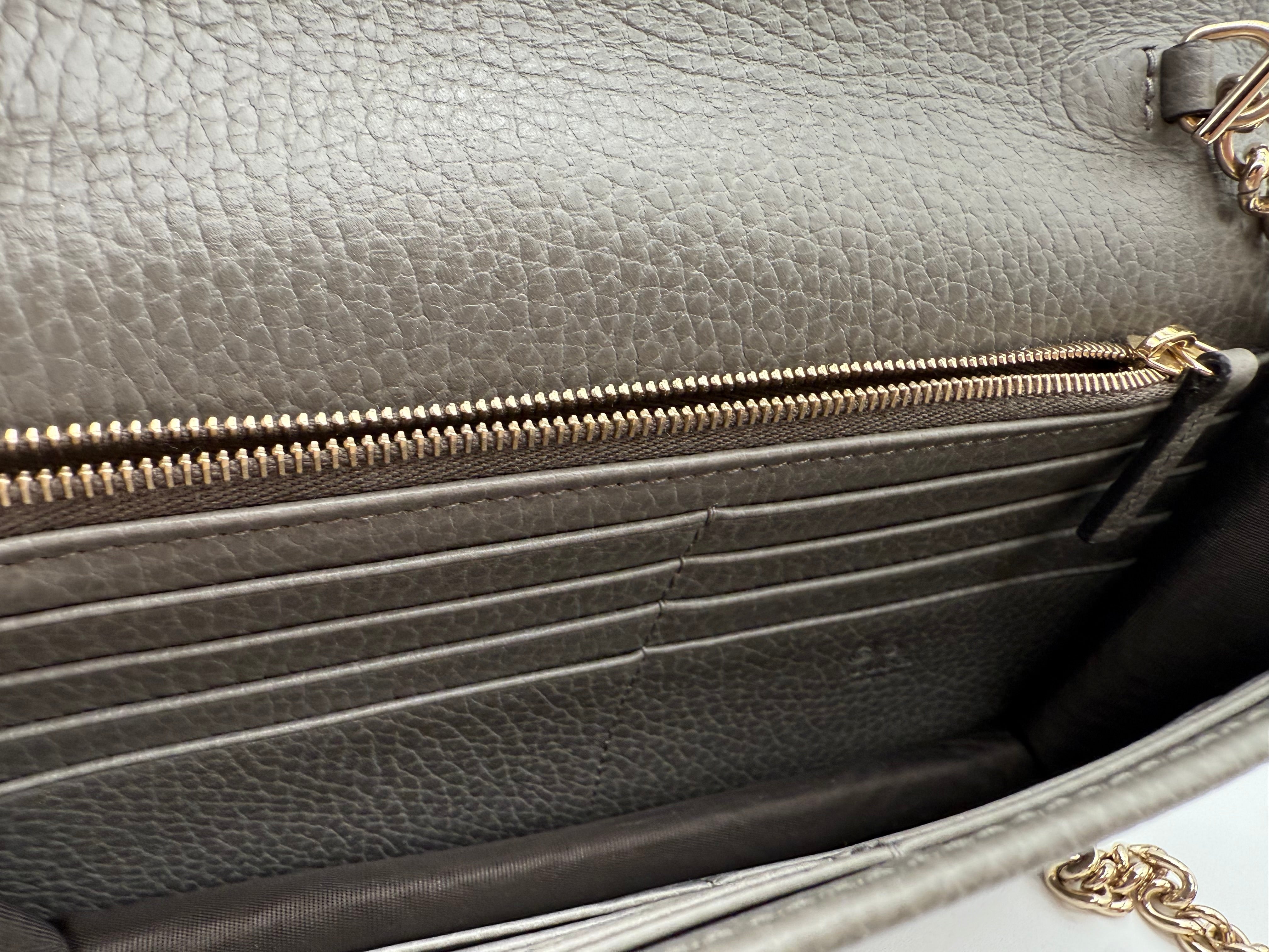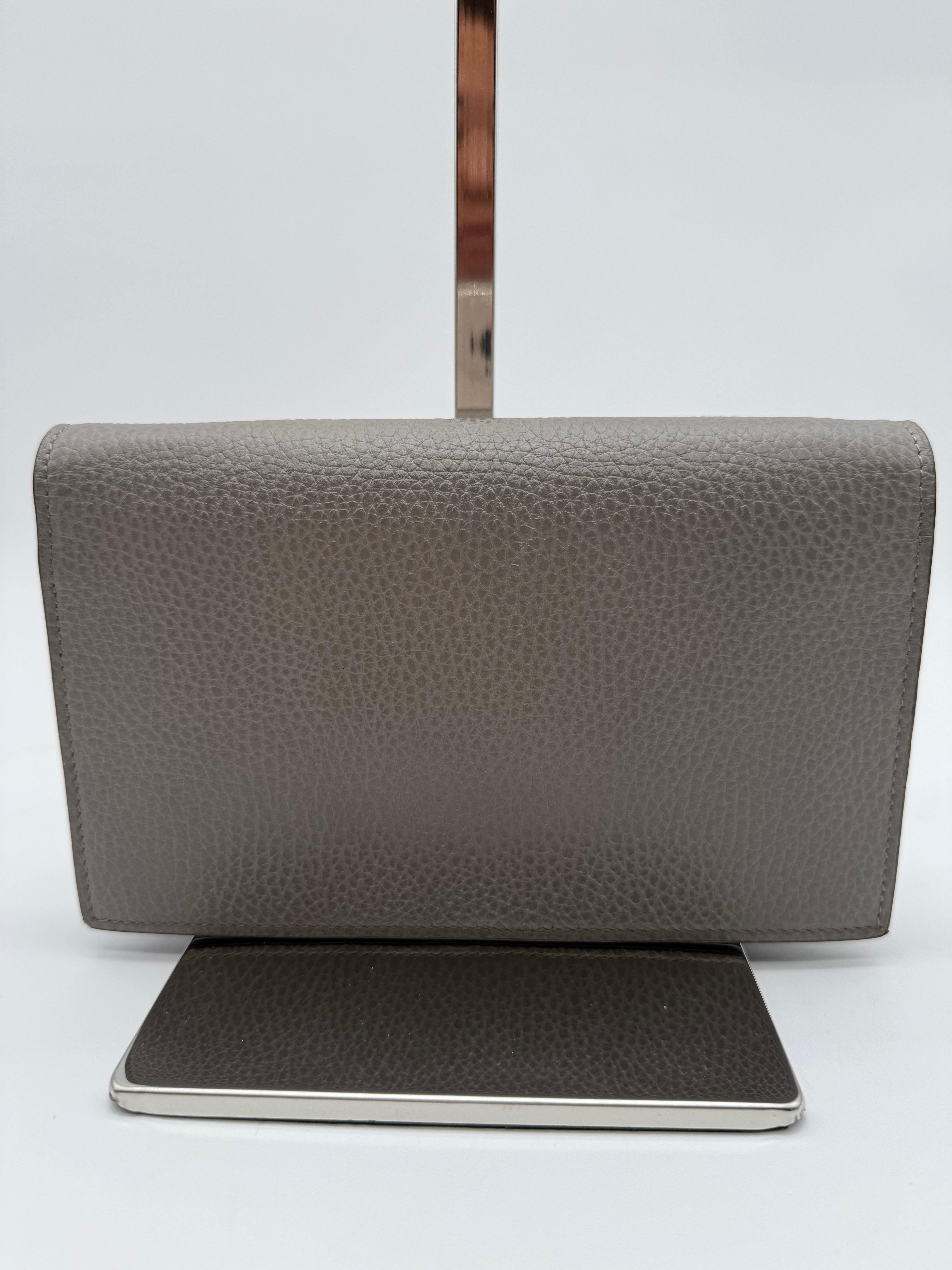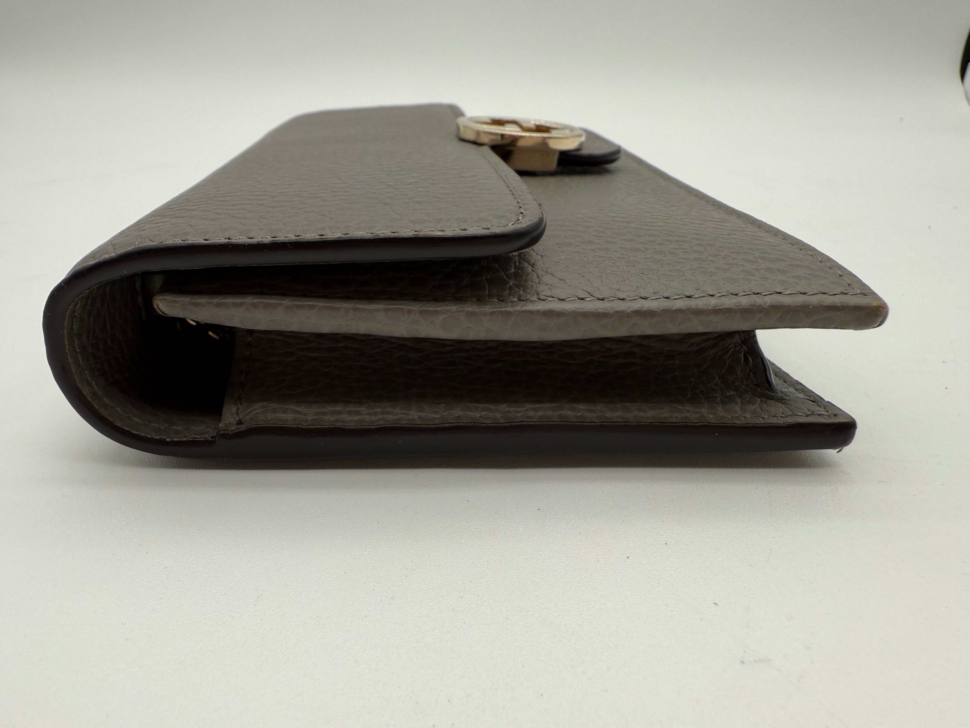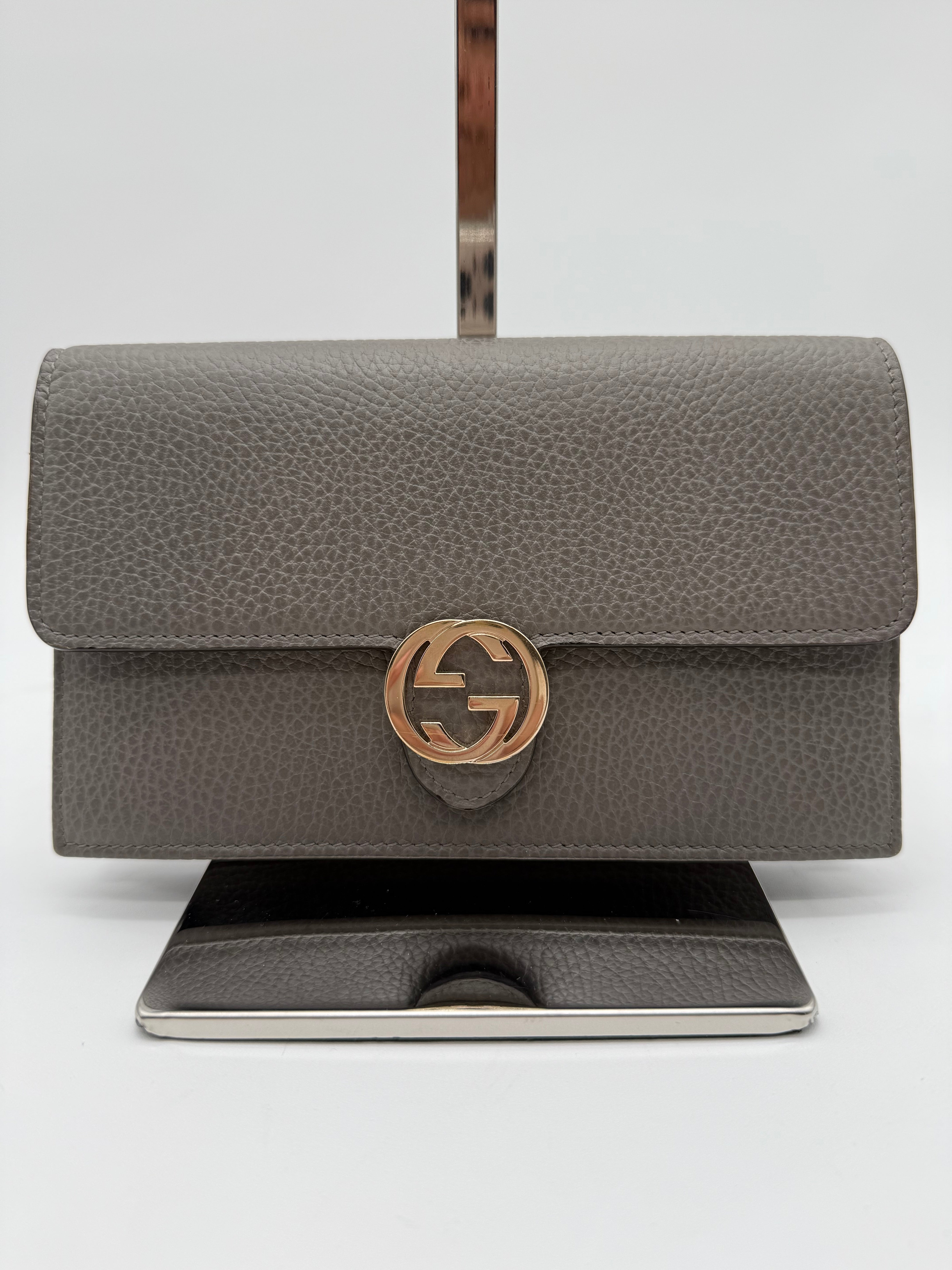 Add a touch of sophistication to your collection with this pre-owned Gucci Interlocking GG Dollar WOC (Wallet on Chain) in gray pebbled leather. Known for its sleek design and versatility, this WOC combines the best of both worlds—luxury and functionality(can even fit iPhone ProMax). Perfect for day-to-night wear, this bag is a stylish companion that easily transitions from casual to elegant looks.