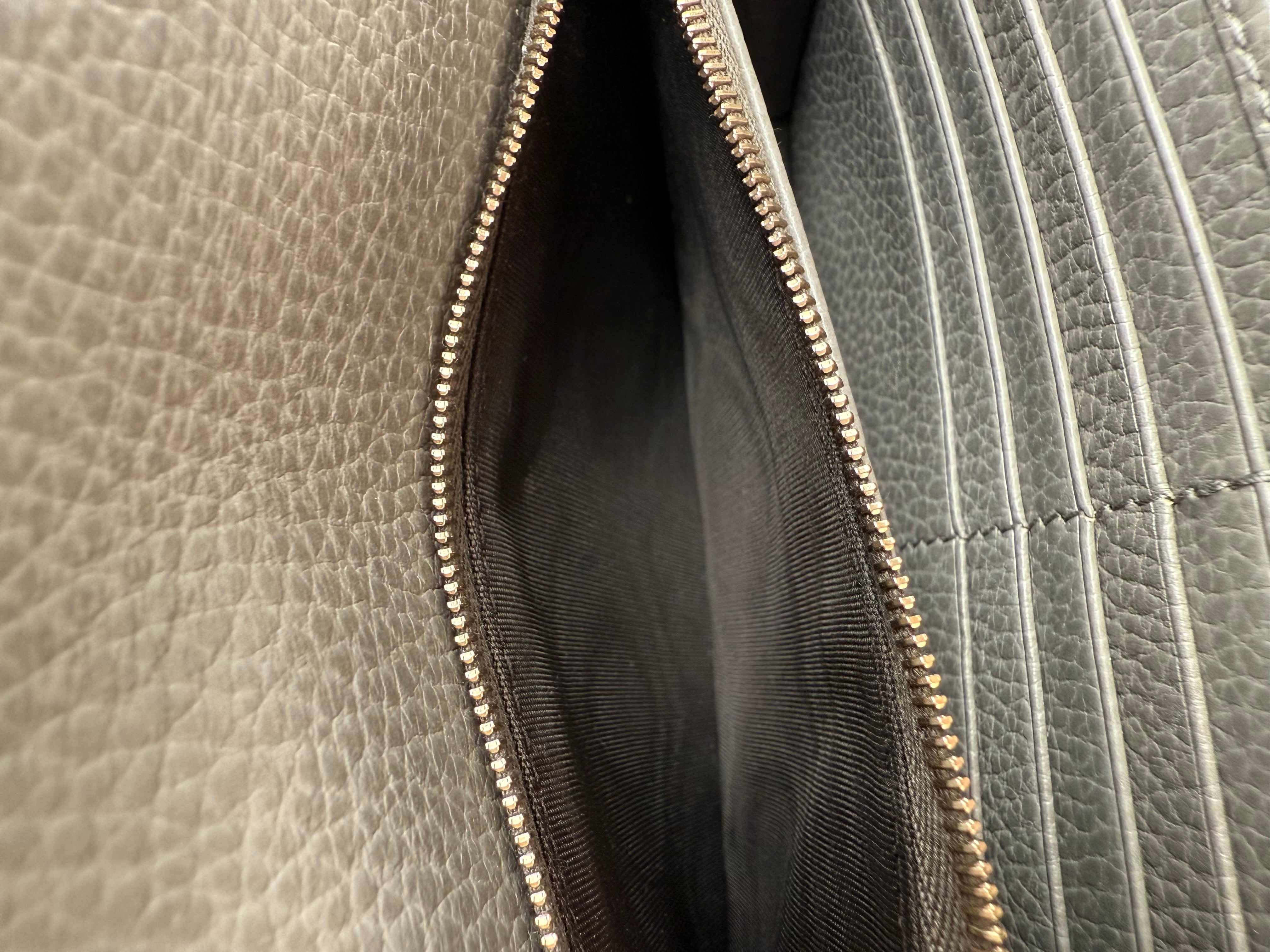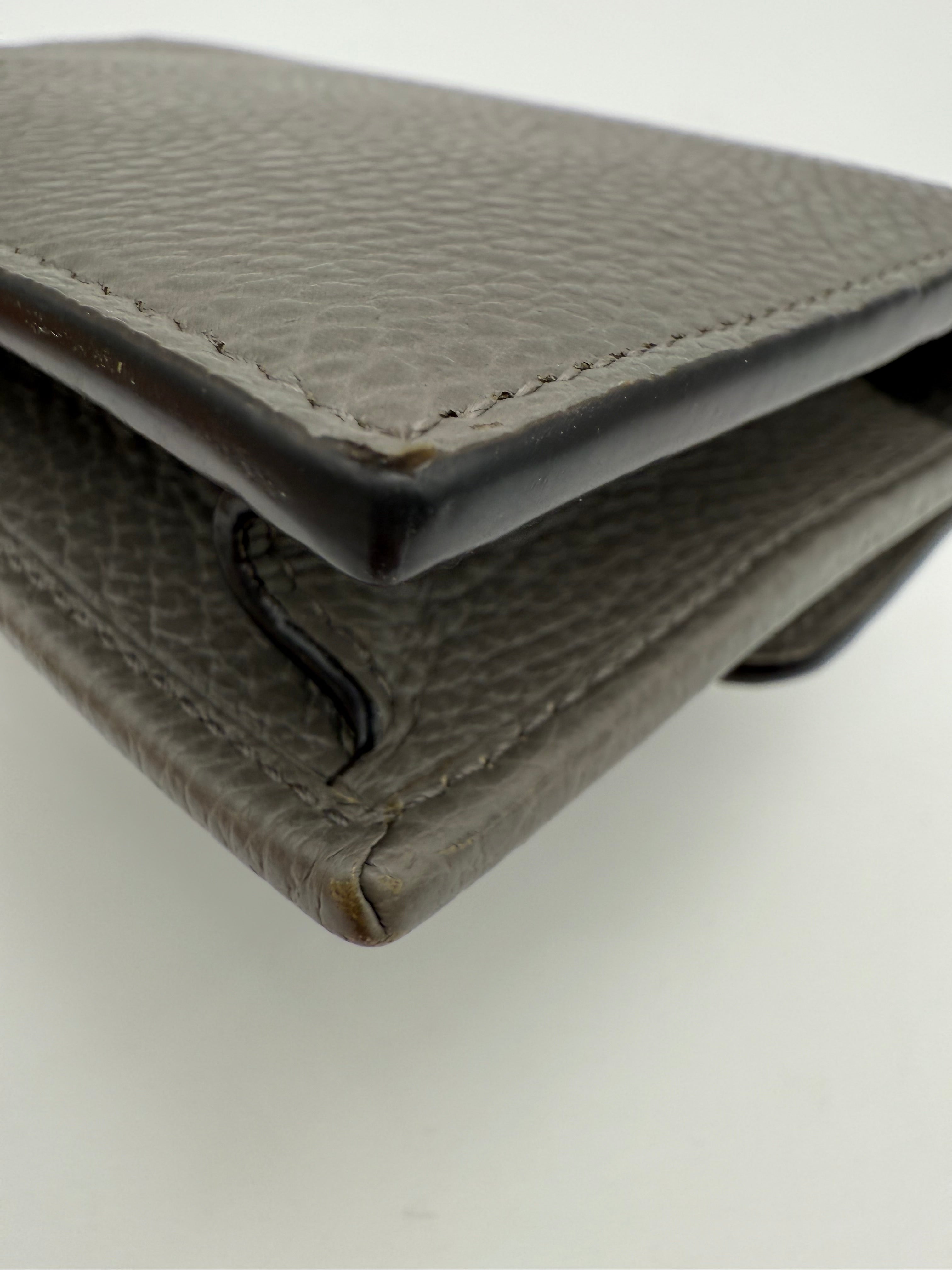 The gray pebbled leather is in great condition with minor signs of use, adding character without compromising the bag’s overall appeal.