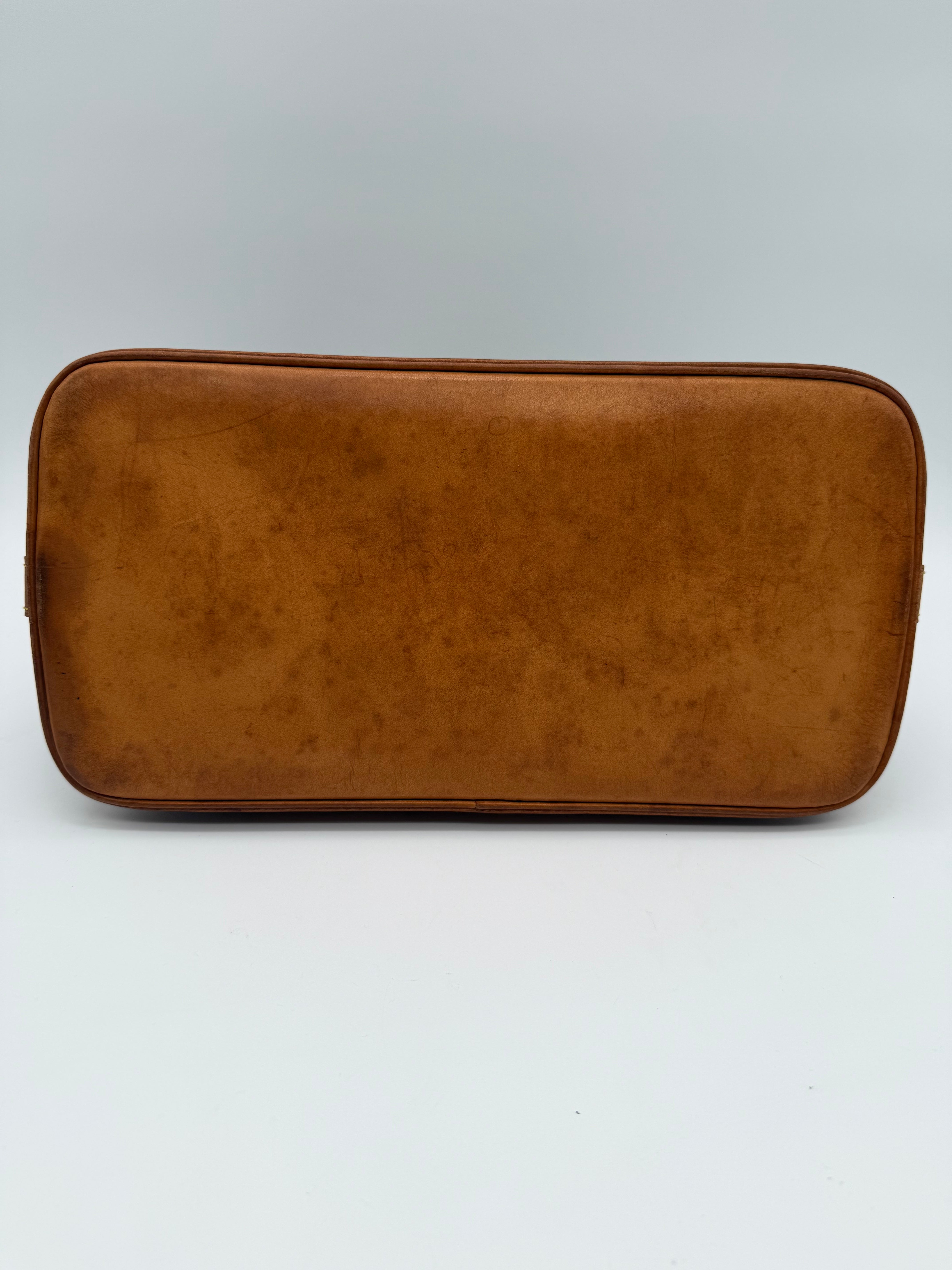 The vachetta leather has developed a warm honey patina, giving it that coveted vintage charm. There are watermarks and a very fine, smooth network of surface-level lines and dryness at the base and handles—purely cosmetic, not deep cracks. Corner rubs at the base show gentle wear consistent with age, while the gold-tone hardware displays tarnishing and use that add to its vintage character.