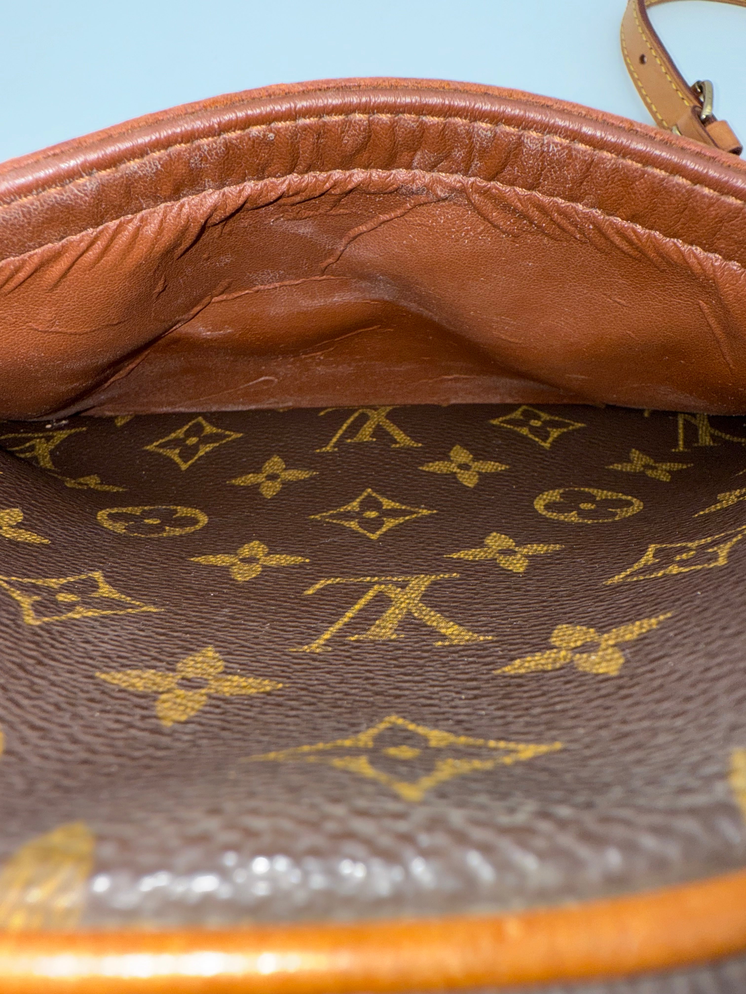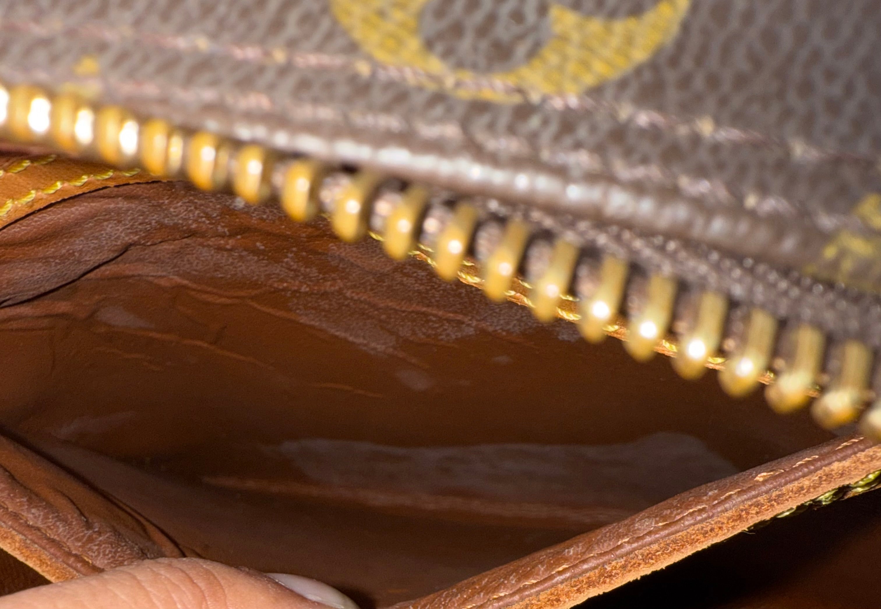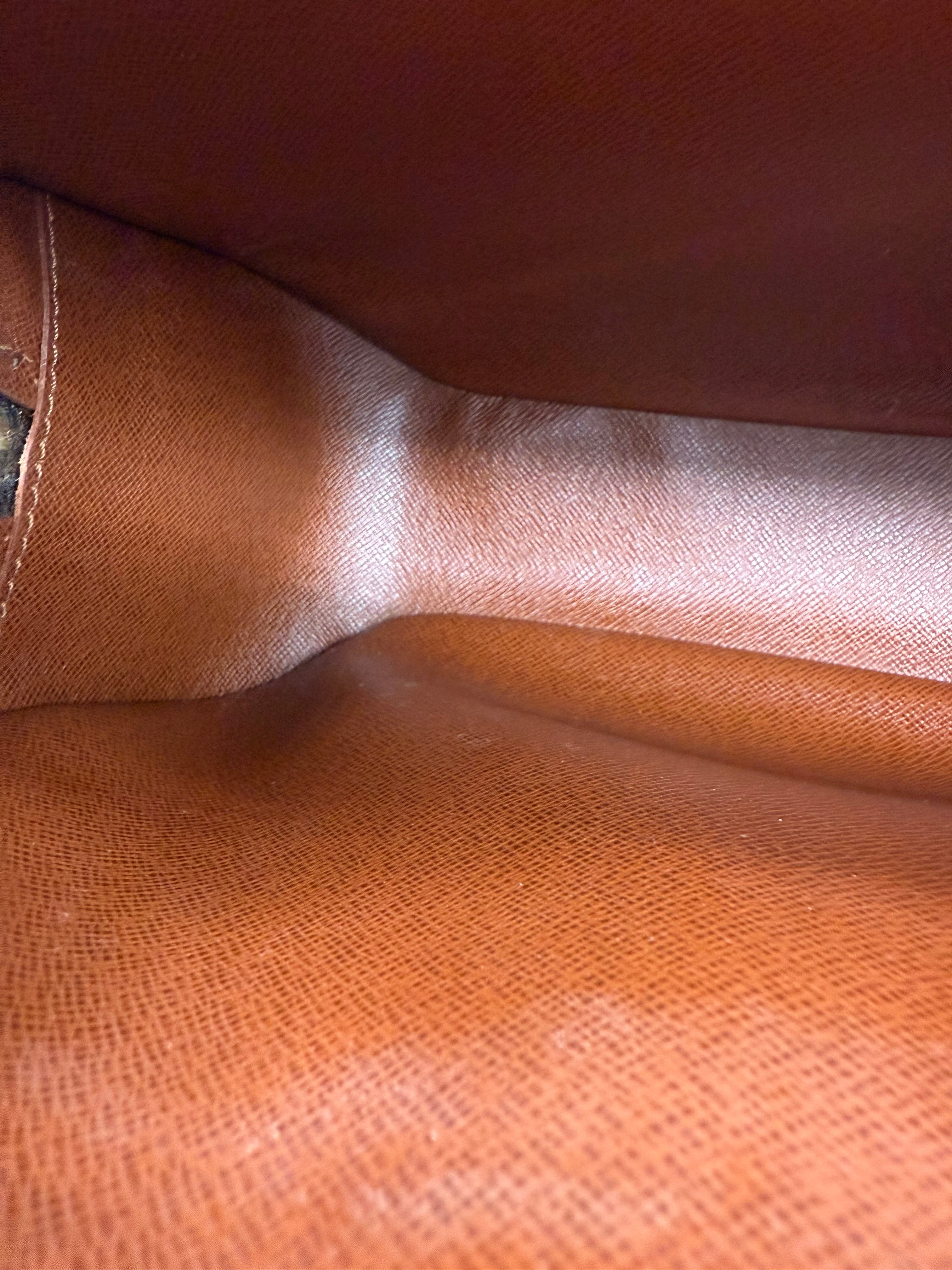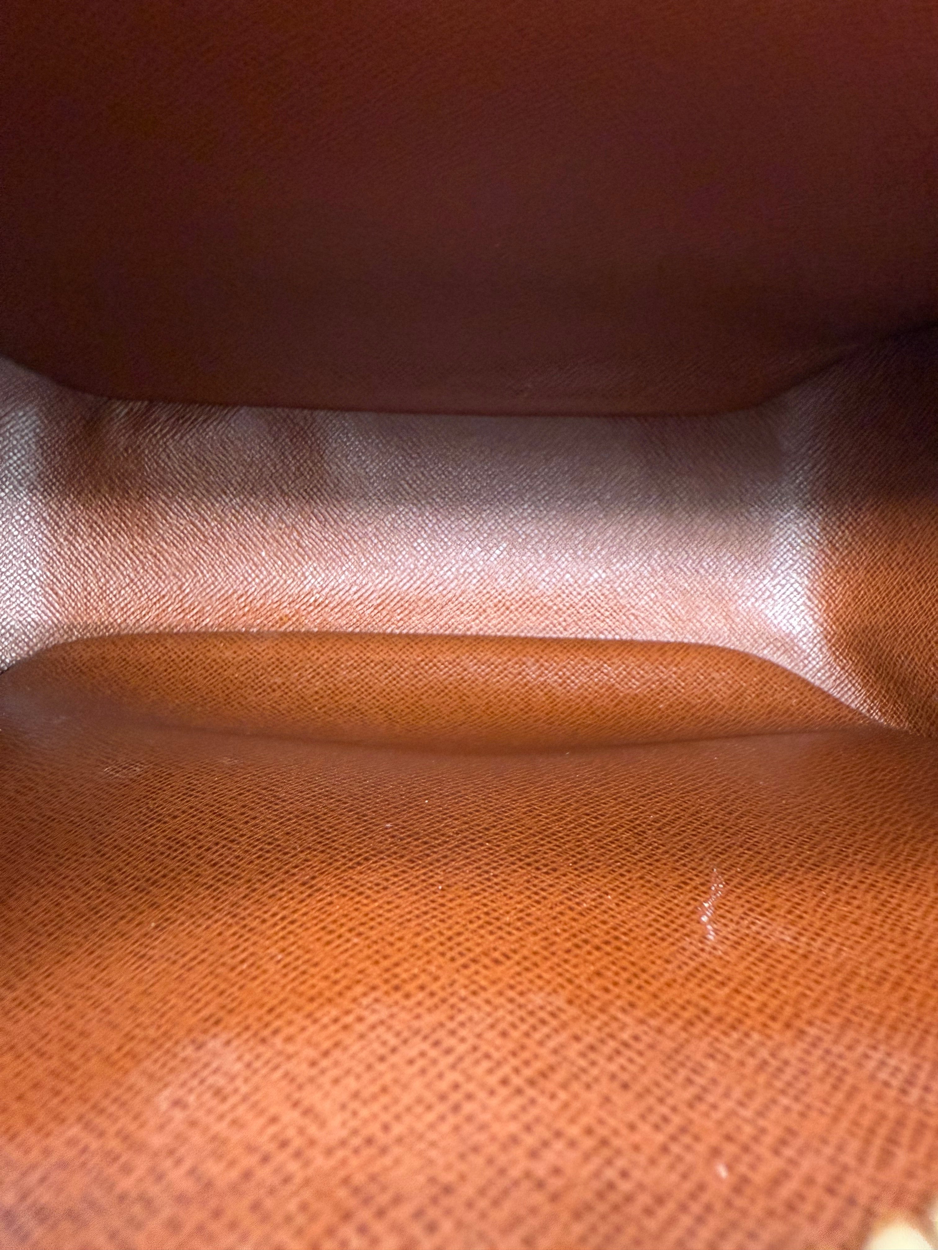 • Condition: Preowned — shows light wear to leather trim and hardware, with minor patina consistent with age and use.  Straps have some minor surface cracks but is still very strong.  Interior/exterior pockets lining feels thin with some wrinkles and spots however no peeling or stickiness.  Hardware has signs of use and tarnishing.  Main interior compartment in very good and clean condition. (see photos for details).