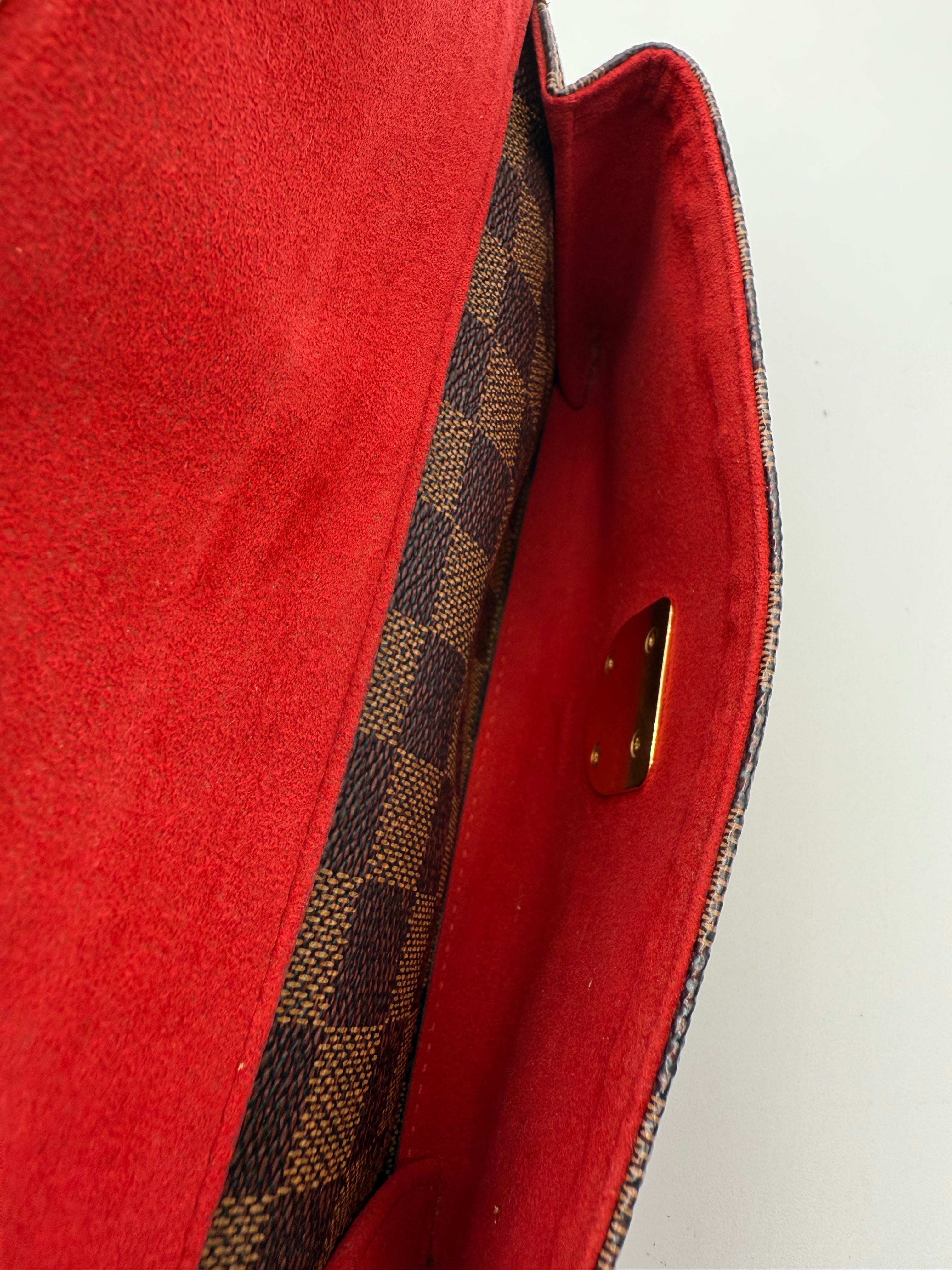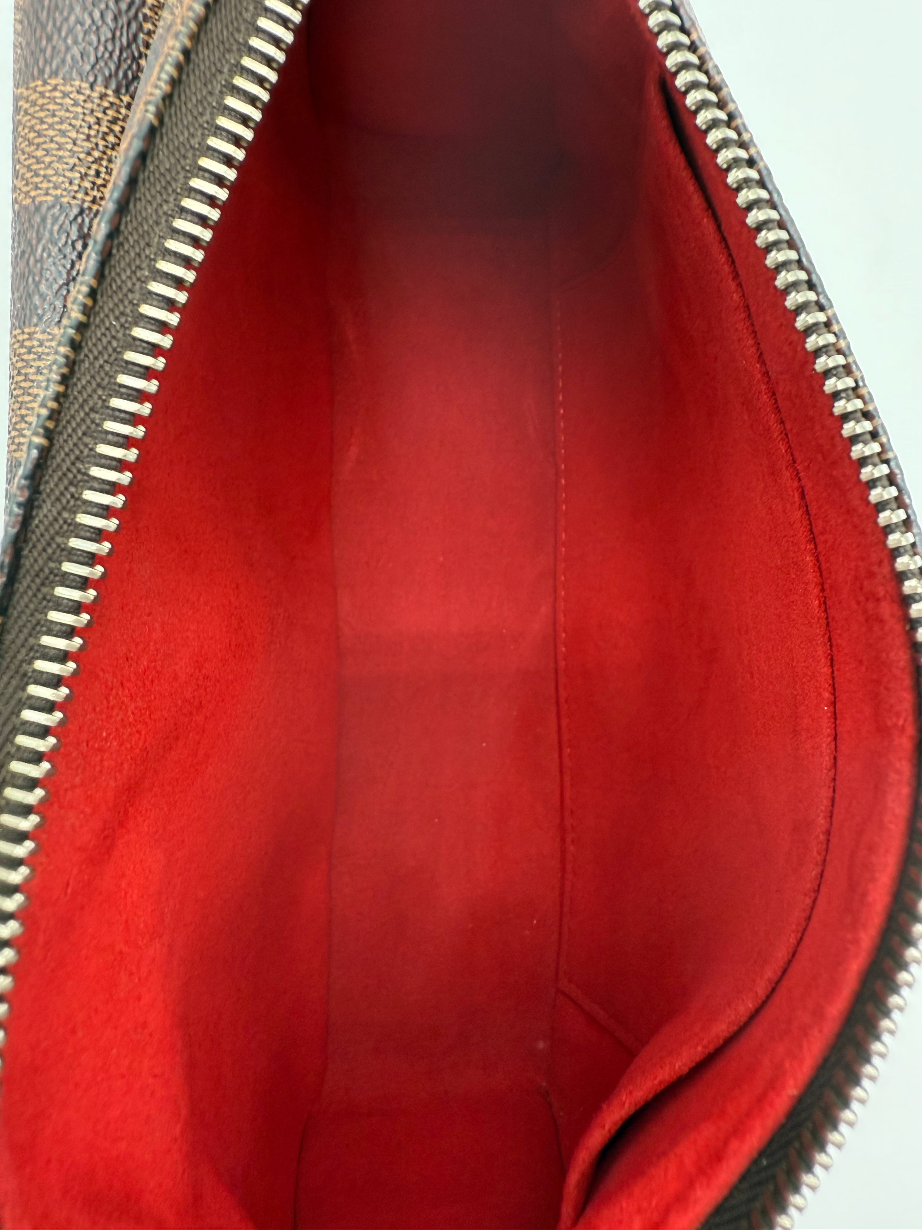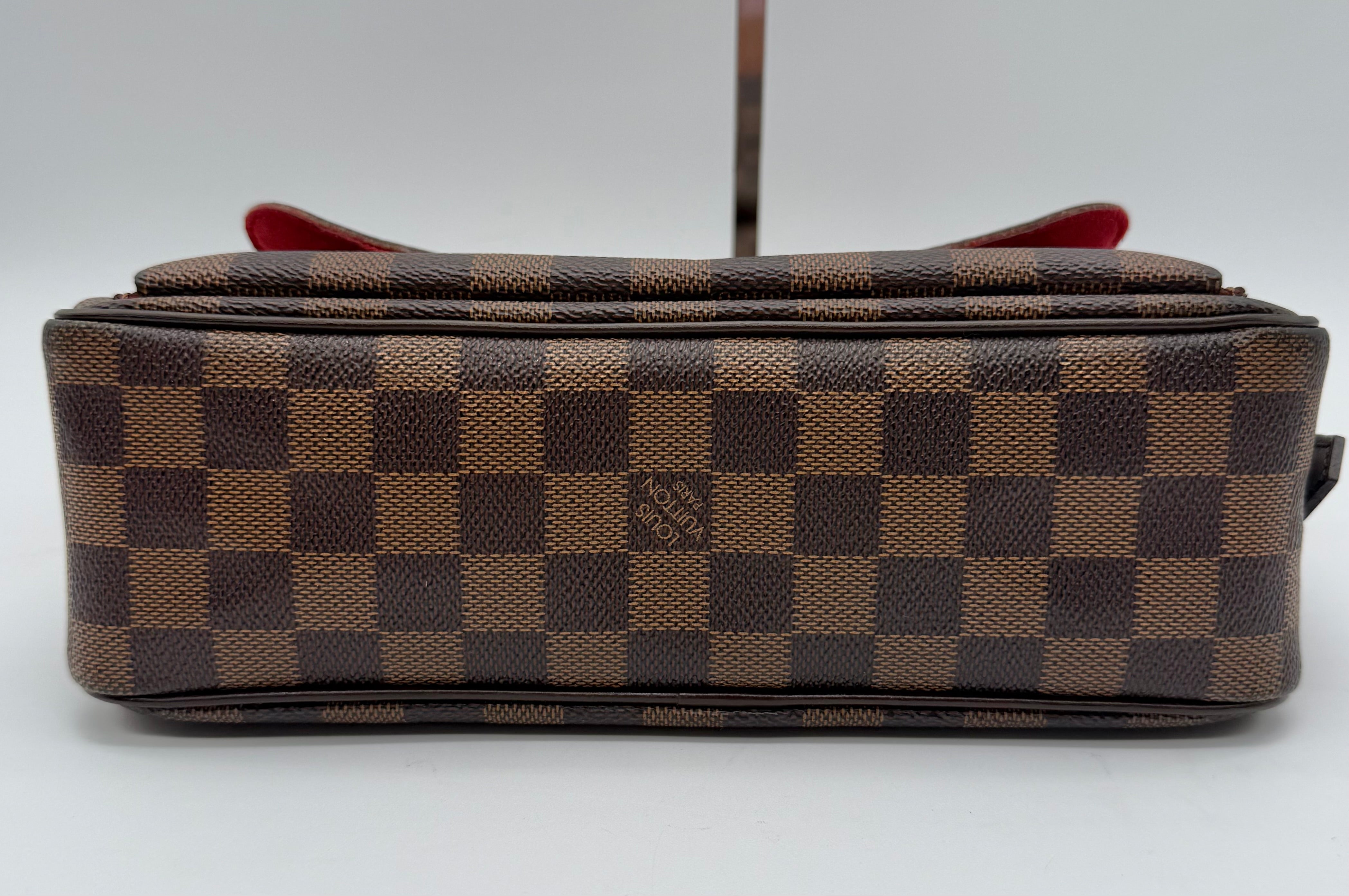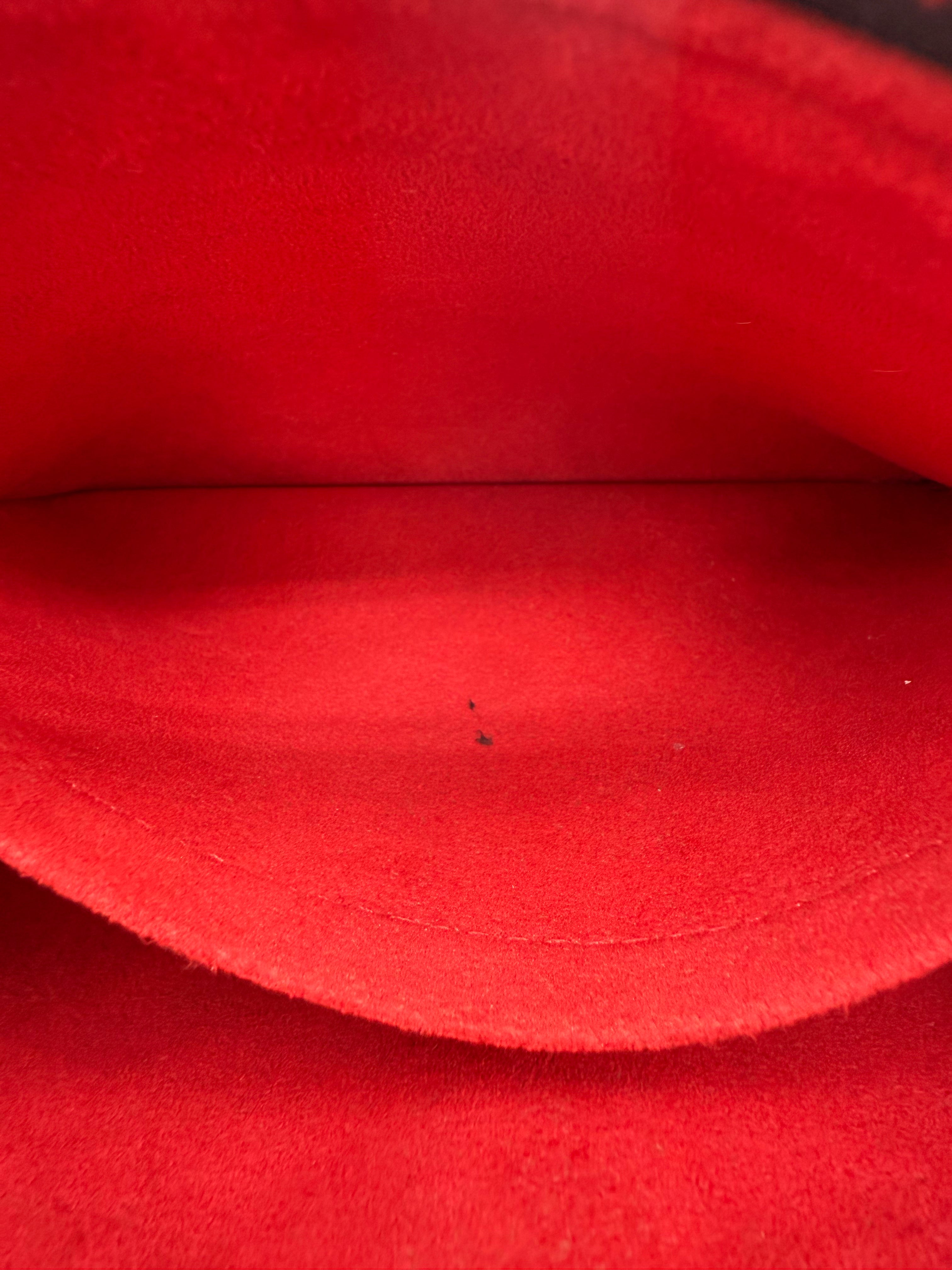 Signature Material: Crafted from Louis Vuitton’s iconic Damier Ebene coated canvas, paired with rich brown leather trim for contrast and durability. Lined alcantara red interior. No holes or large stains.