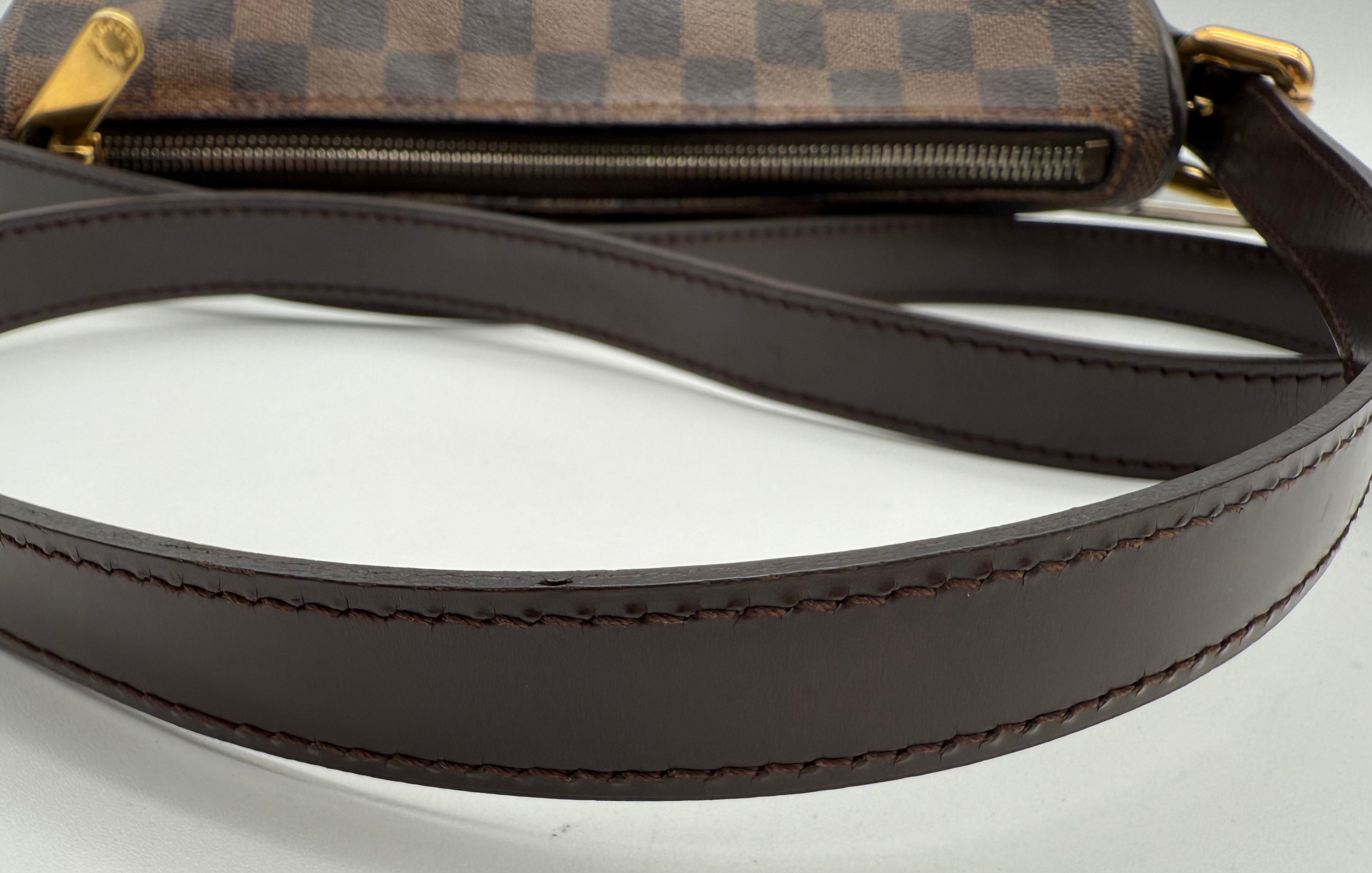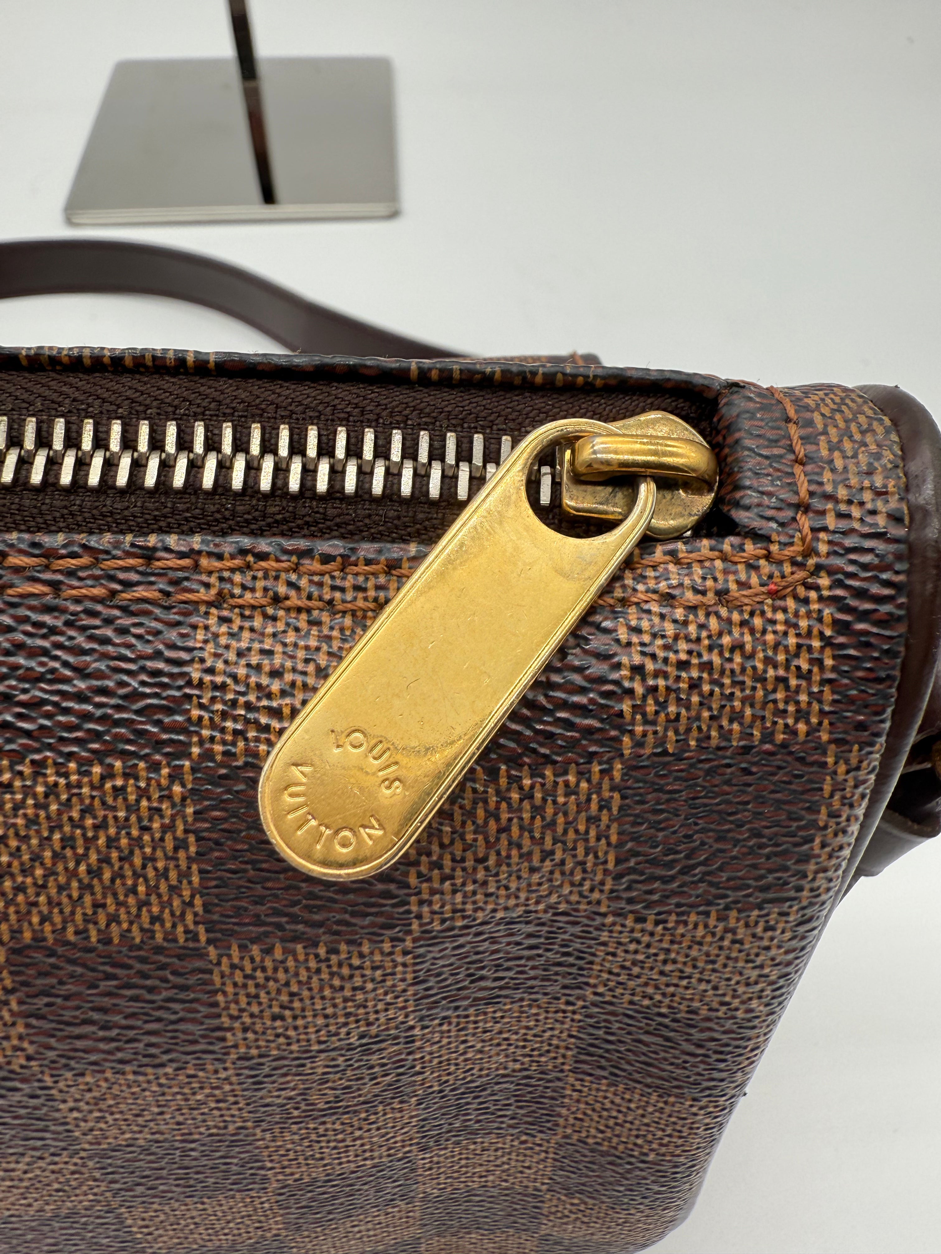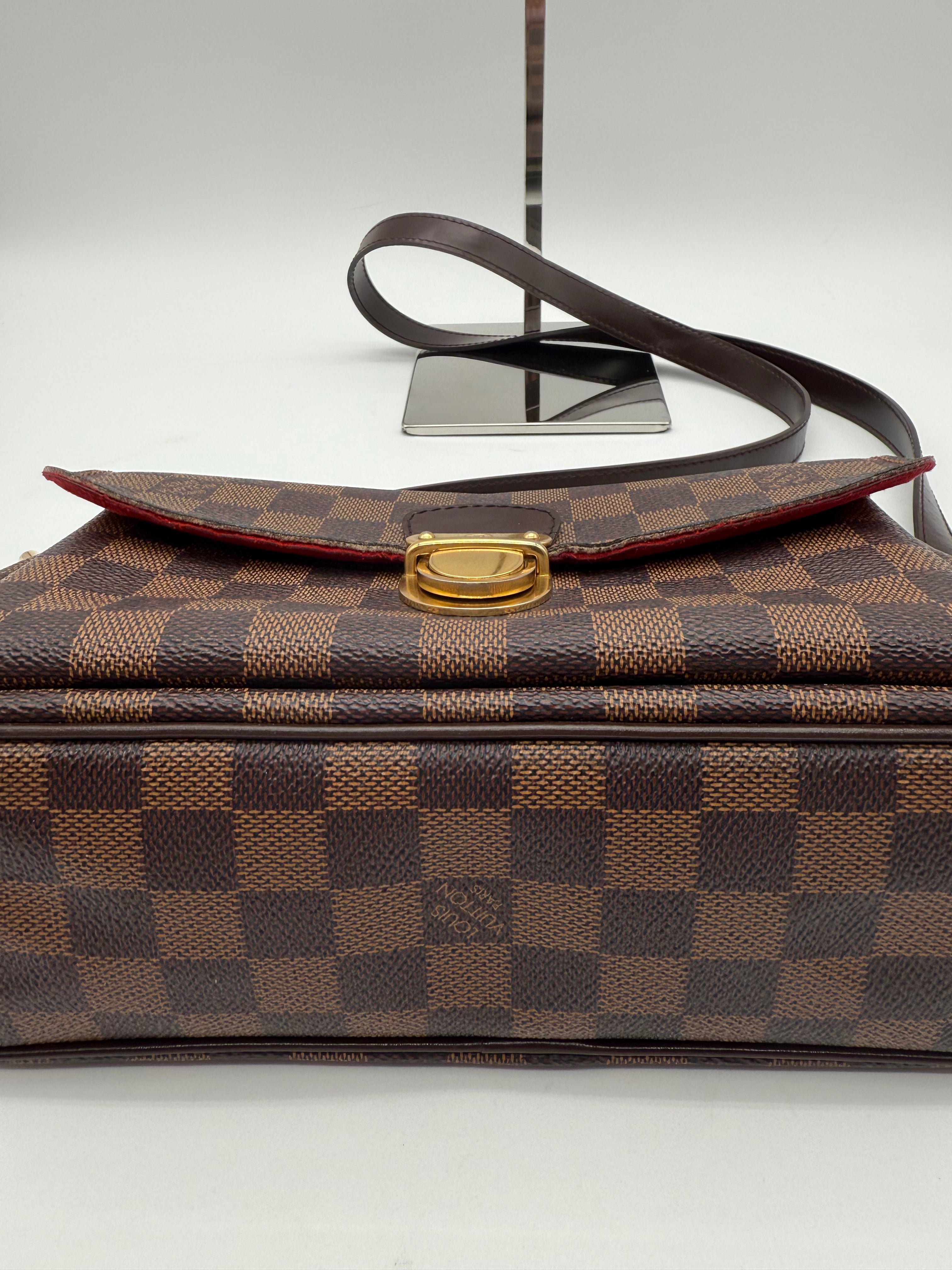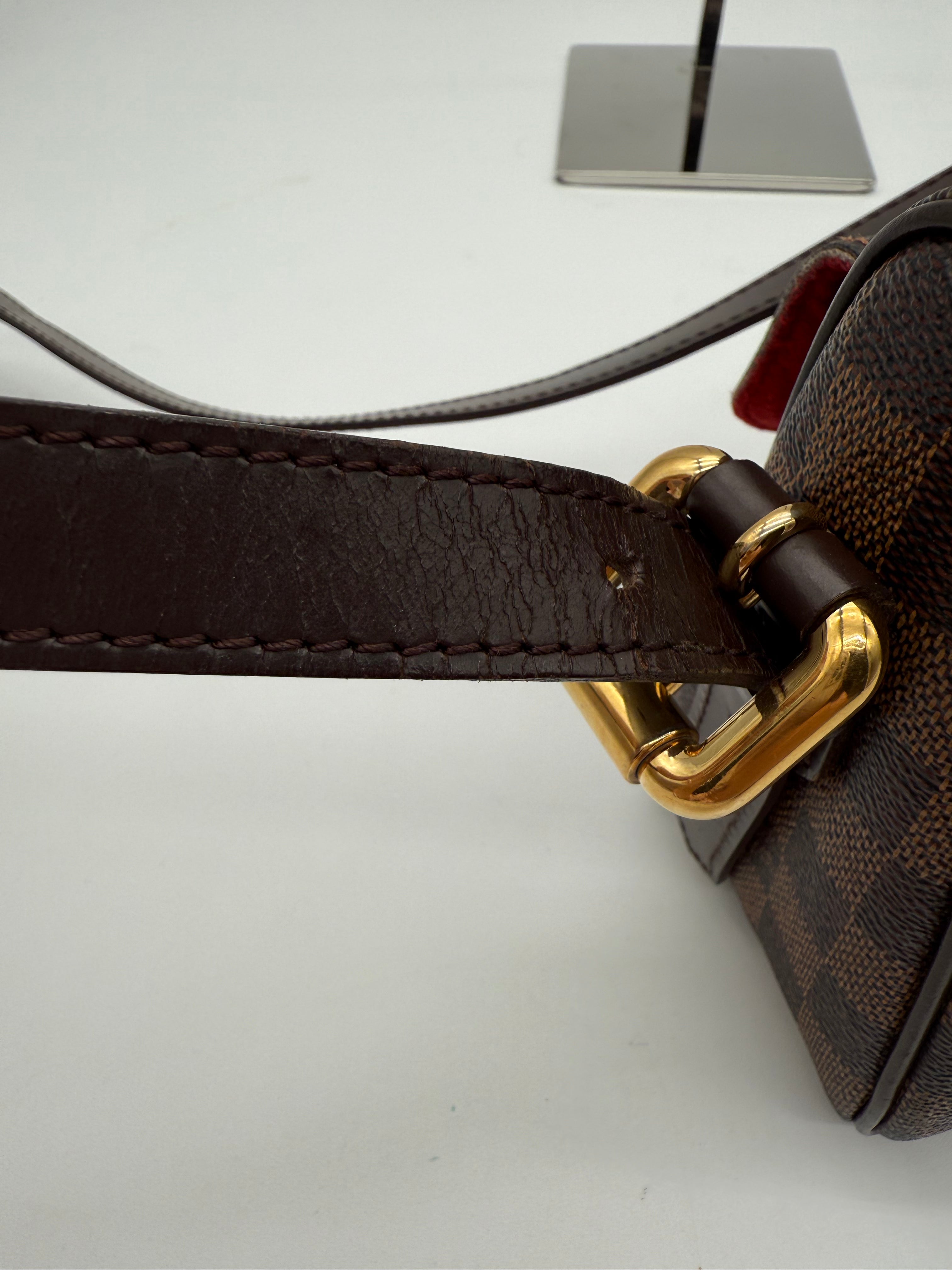 Signature Material: Crafted from Louis Vuitton’s iconic Damier Ebene coated canvas, paired with rich brown leather trim for contrast and durability. Lined alcantara red interior. No holes or large stains.
