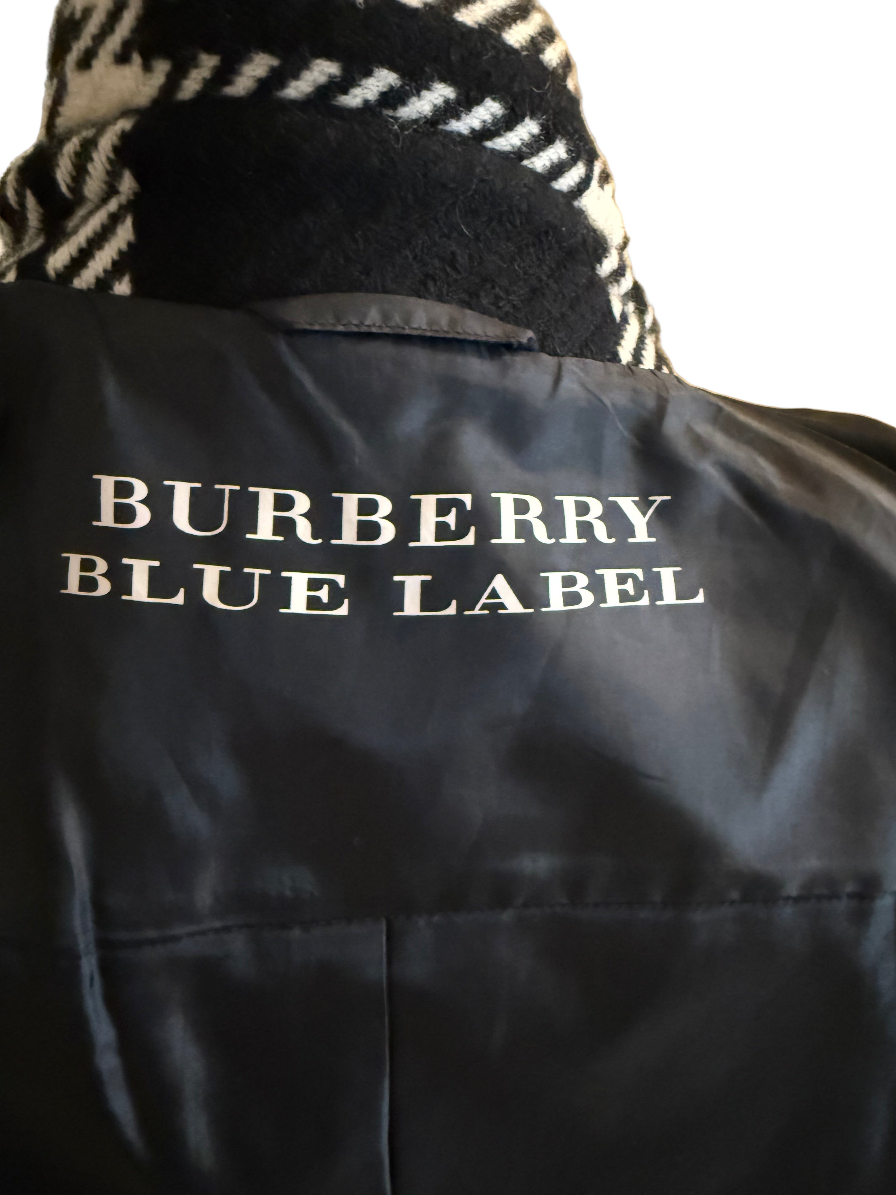 Elevate your cold-weather wardrobe with this sophisticated Burberry London Blue Label peacoat, crafted from a luxurious wool blend for warmth, structure, and timeless appeal. Designed in a classic black and white plaid pattern, this coat embodies Burberry’s heritage aesthetic with a modern, feminine edge.